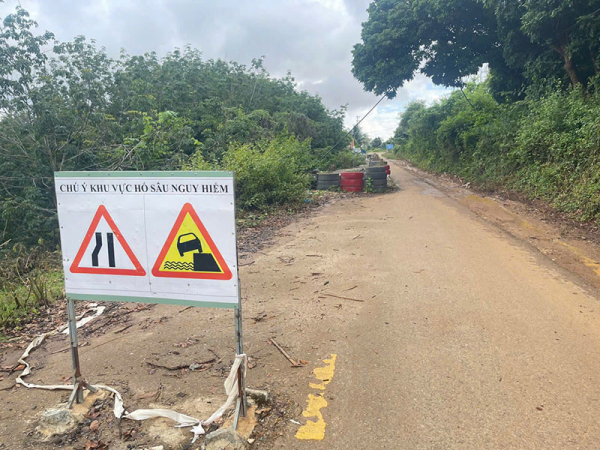 Cơ quan chức năng cắm biển cảnh báo tại vị trí đường bị sụt lún.