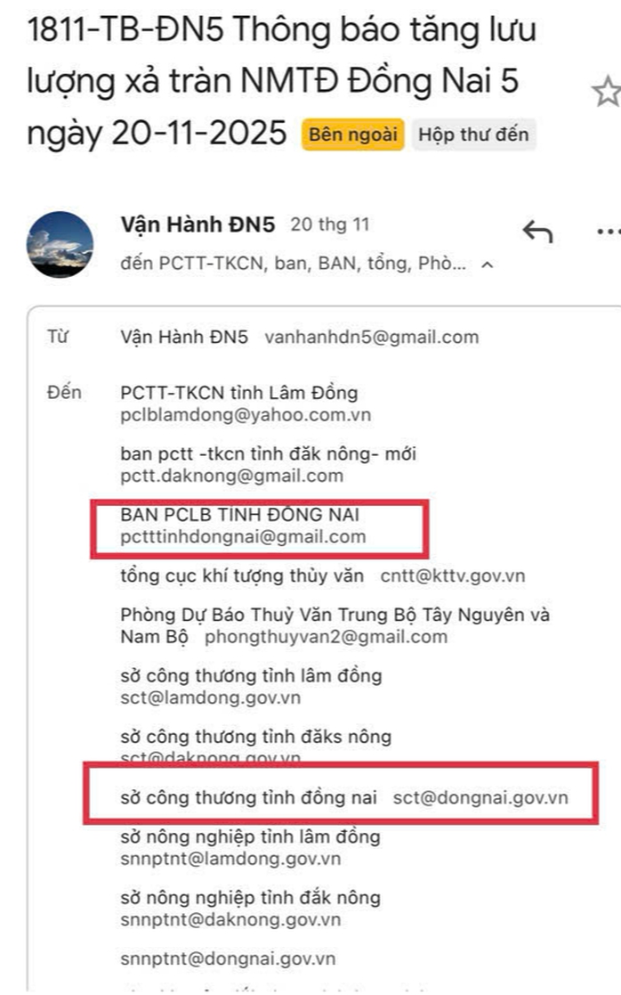 Nơi gửi các thông báo xả tràn cho các đơn vị tỉnh Đồng Nai