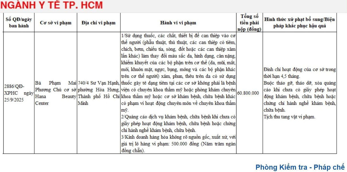 Cá nhân bà Phạm Mai Phương – Chủ cơ sở Hana Beauty Center (740 Sư Vạn Hạnh, phường Hòa Hưng, TP HCM) bị phạt 60,8 triệu đồng và đình chỉ hoạt động của cơ sở 4,5 tháng; Buộc tháo gỡ, tháo dỡ, xóa quảng cáo khi chưa có giấy phép hoạt động khám bệnh, chữa bệnh hoặc chứng chỉ hành nghề khám bệnh chữa bệnh; Tịch thu tang vật vi phạm.