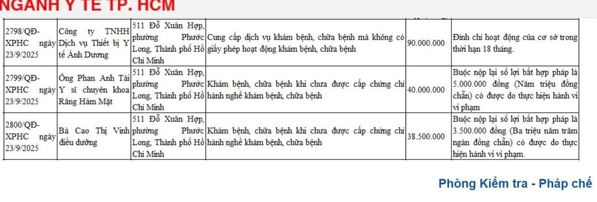 Theo đó, Công ty TNHH Dịch vụ Thiết bị y tế Ánh Dương (511 Đỗ Xuân Hợp, phường Phước Long, TP HCM) bị phạt 90 triệu đồng, đình chỉ hoạt động 18 tháng do cung cấp dịch vụ khám bệnh, chữa bệnh mà không có giấy phép hoạt động.