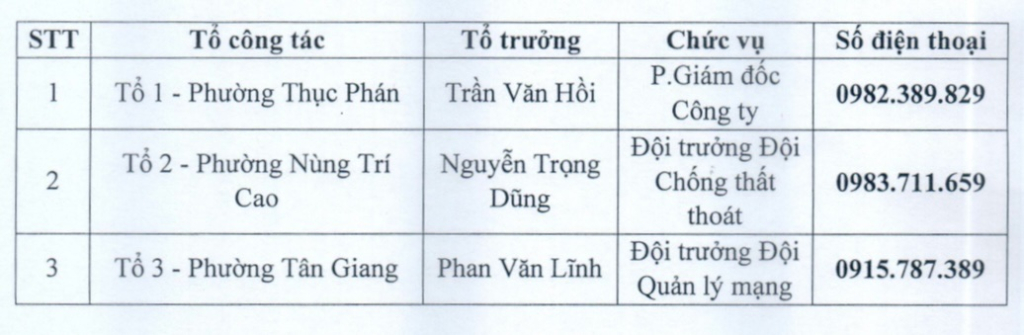 Để kịp thời xử lý các tình huống, sự cố phát sinh trong công tác khắc phục hậu quả của cơn bão số 11 vừa qua, Công ty TNHH một thành viên cấp nước Cao Bằng thông báo tới các quý khách hàng thông tin của các tố công tác chịu trách nhiệm về công tác Quản lý mạng lưới và khắc phục sự cố sau cơn bão số 11 năm 2025 tại các phường trên địa bàn tỉnh, cụ thế như sau: