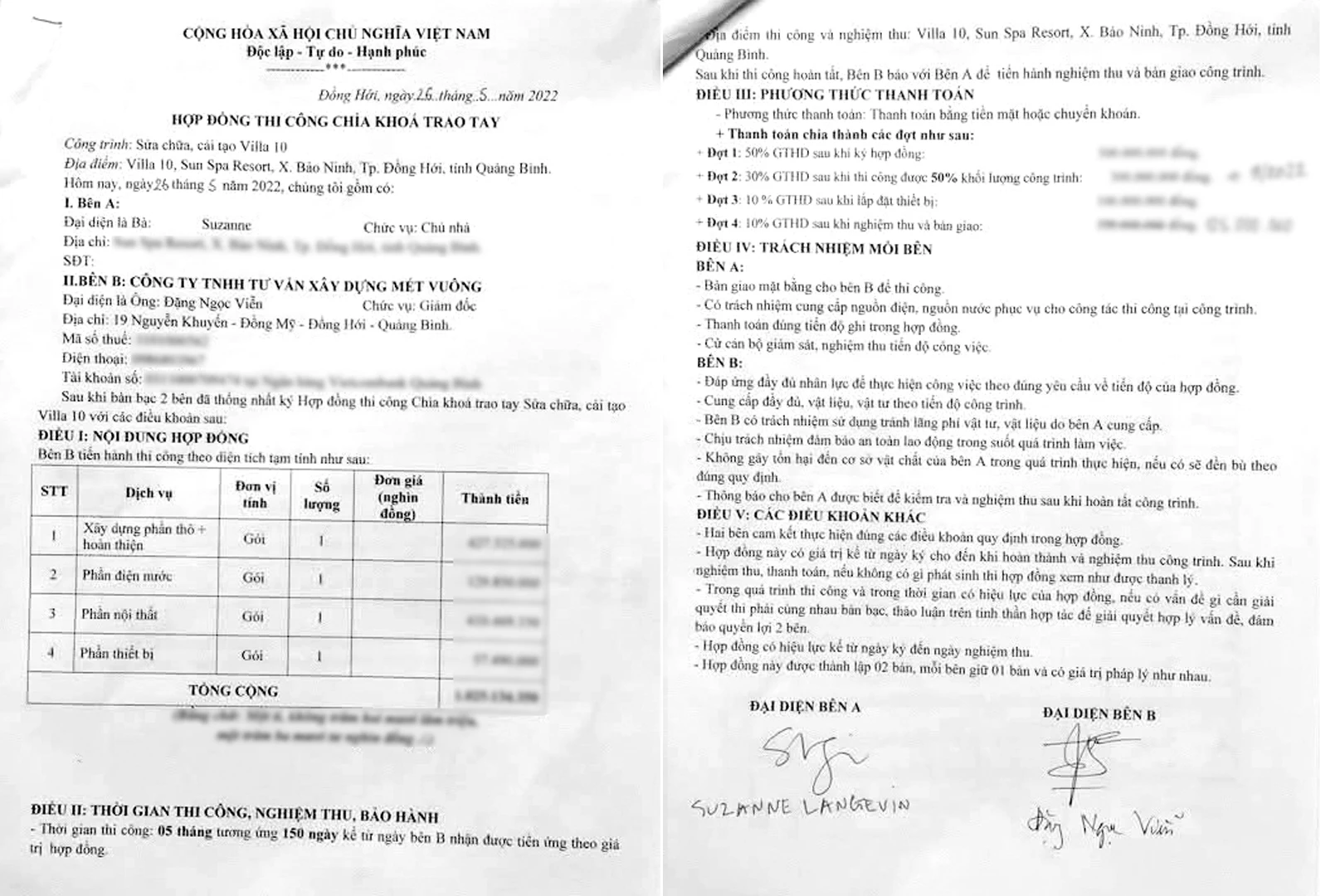 Hợp đồng thi công theo hình thức “chìa khóa trao tay” giữa bà Langevin Suzanne và Công ty TNHH Tư vấn Xây dựng Mét Vuông - Ảnh: D.C.H