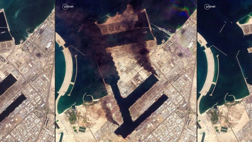 Chuỗi hình ảnh vệ tinh của Planet Labs cho thấy cảng thương mại Jebel Ali của Dubai trước và sau khi bị tấn công bởi Iran. Ảnh: Planet Labs