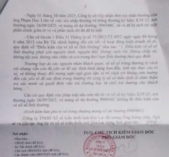 Công văn nêu rõ, ông L sở hữu vé số dự thưởng 996946C, ký hiệu K39-25 của Công ty XSKT tỉnh Gia Lai trúng giải đặc biệt 2 tỉ đồng trong kỳ quay mở thưởng ngày 26-9.