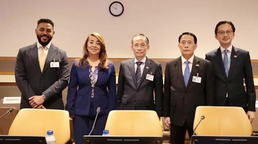 Quyền Bộ trưởng Bộ Ngoại giao Lê Hoài Trung cùng các đồng chủ tọa tại sự kiện giới thiệu lễ mở ký Công ước của Liên hợp quốc về phòng, chống tội phạm mạng tại trụ sở Liên hợp quốc ở New York vào ngày 22-9. Ảnh: TTXVN