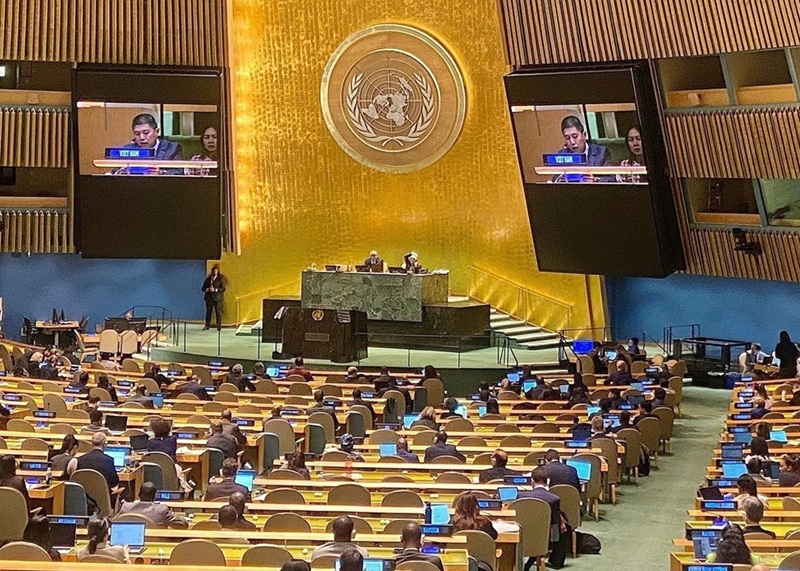 Đại diện Phái đoàn Việt Nam phát biểu tại sự kiện thông qua Công ước Hà Nội, chiều 24/12/2024 (giờ New York). (Ảnh: TTXVN).