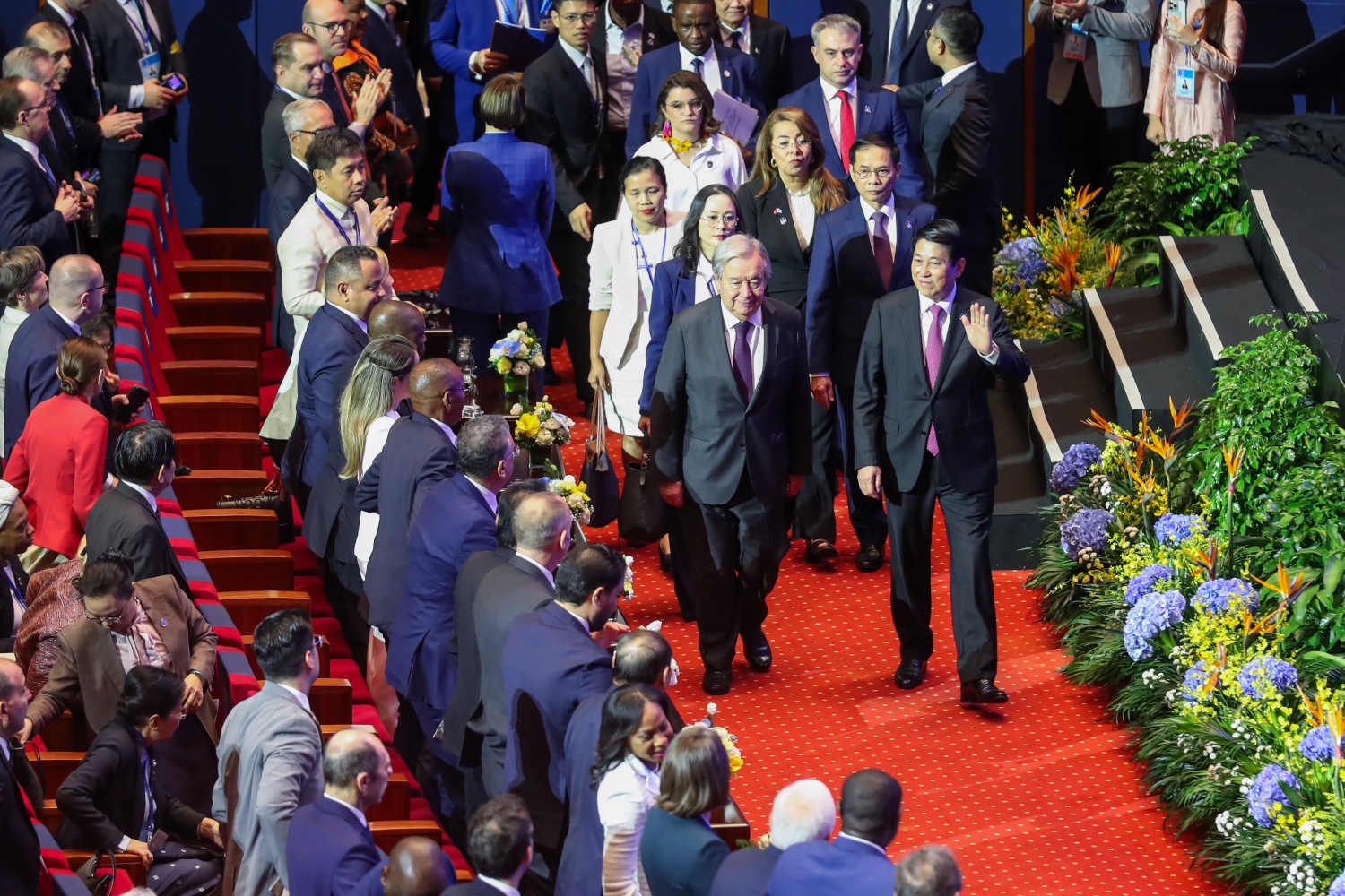 Chủ tịch nước Lương Cường chủ trì buổi lễ cùng với sự tham dự của Tổng Thư ký Liên Hợp Quốc Antonio Guterres.