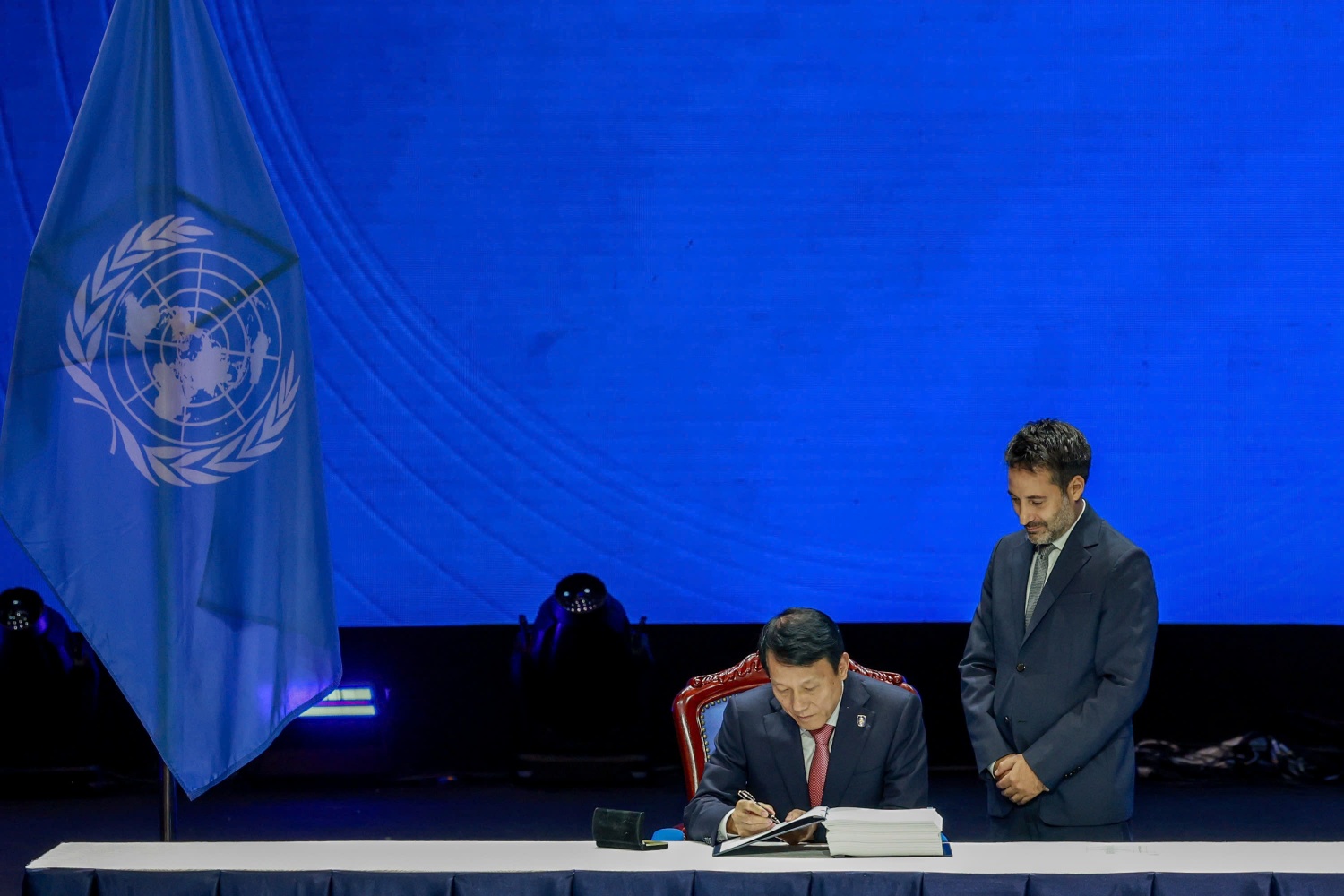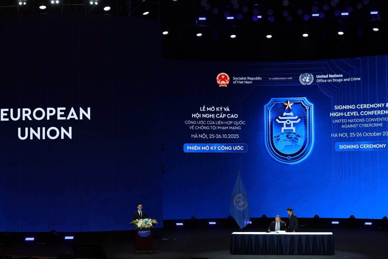 Đại diện 60 nước ký Công ước Liên Hợp Quốc về Chống tội phạm mạng tại Hà Nội trong ngày mở ký, thể hiện cam kết chung cùng xây dựng một không gian mạng an toàn.