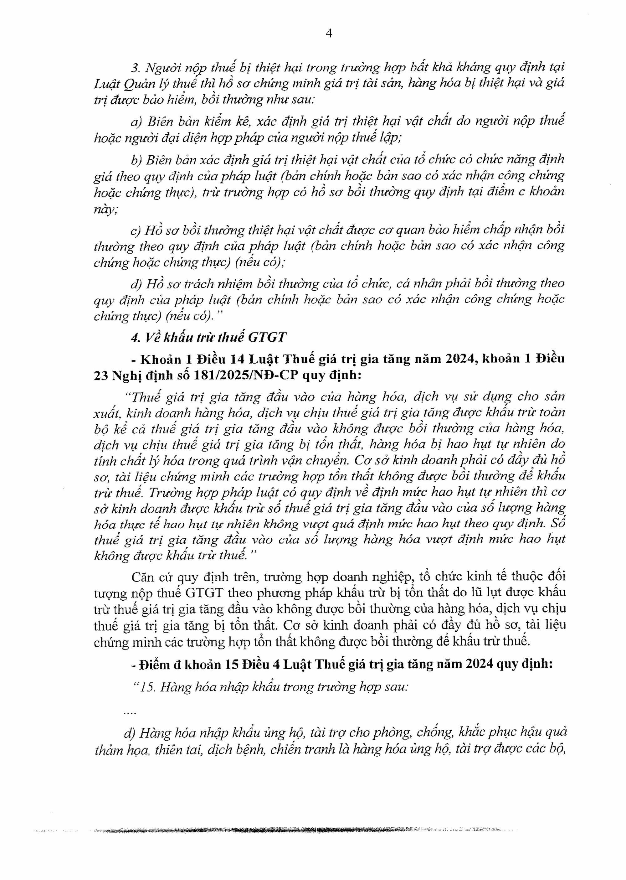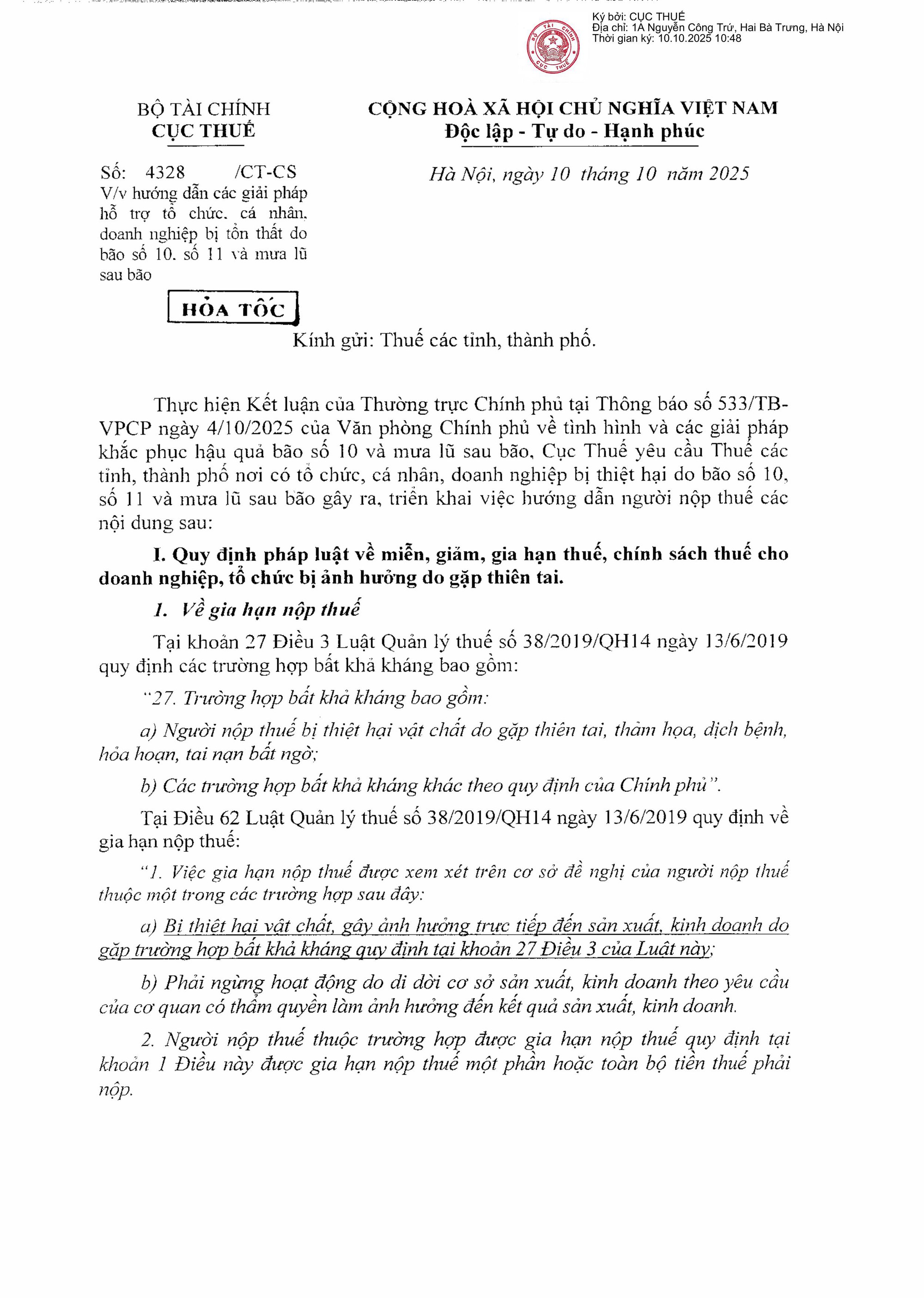 Thực hiện Kết luận của Thường trực Chính phủ tại Thông báo số 533/TB-VPCP ngày 4/10/2025 của Văn phòng Chính phủ về tình hình và các giải pháp khắc phục hậu quả bão số 10, bão số 11 và mưa lũ sau bão, Cục Thuế yêu cầu Thuế các tỉnh, thành phố nơ có tổ chức, cá nhân, doanh nghiệp bị thiệt hại do bão số 10, bão số 11 và mưa lũ sau bão gây ra triển khai việc hướng dẫn người nộp thuế các nội dung sau: