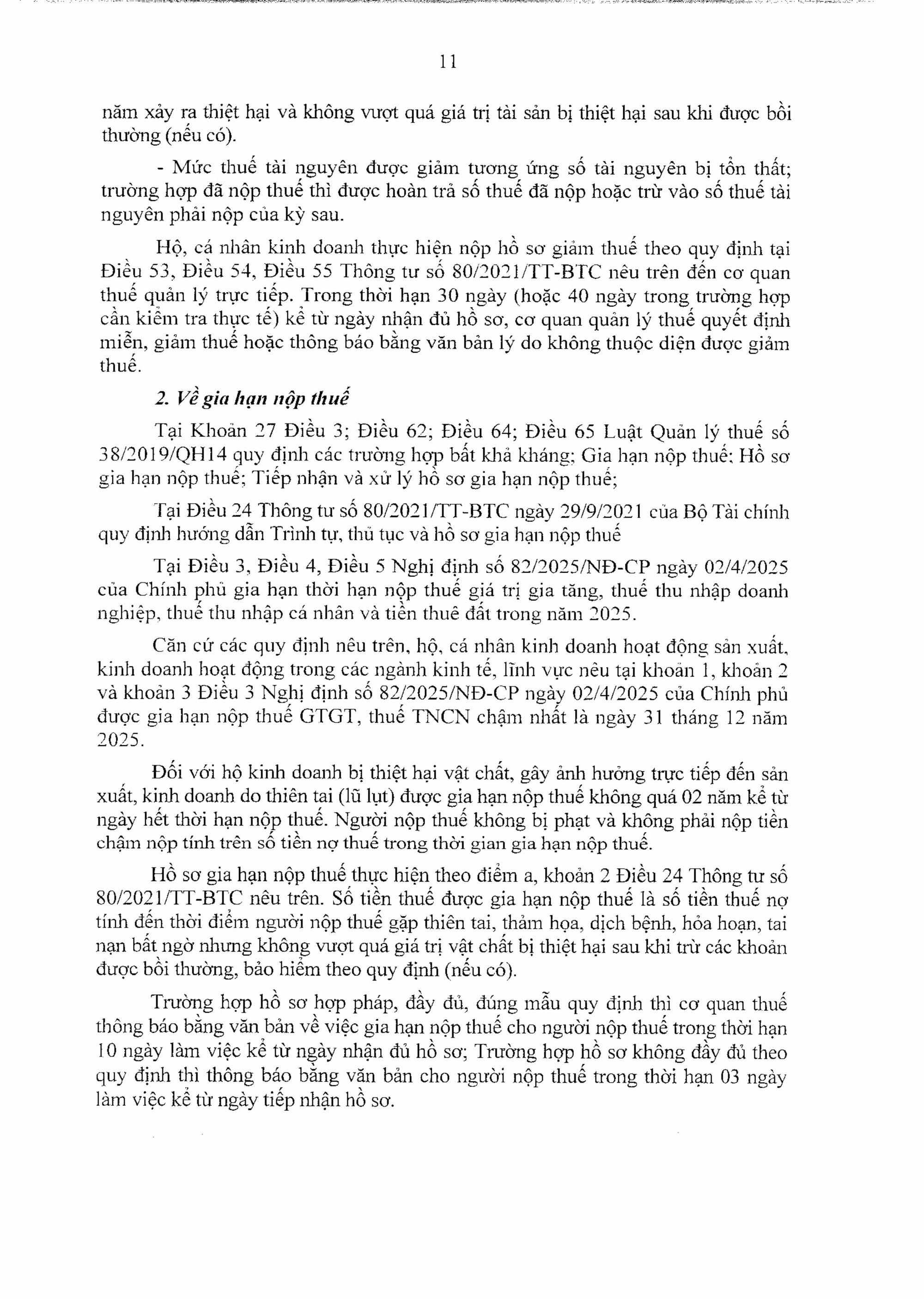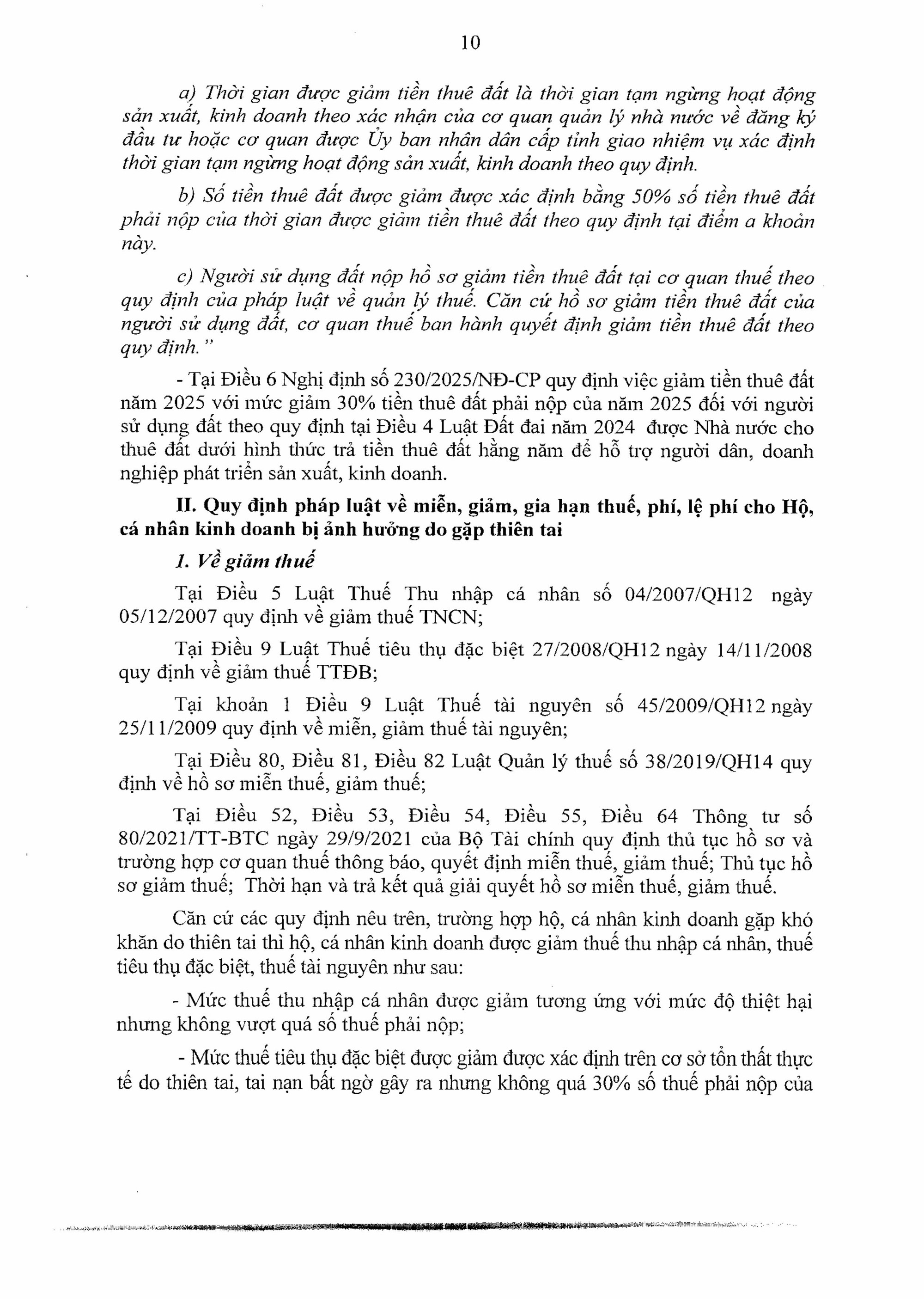 Thứ hai, quy định của pháp luật về miễn, giảm, gia hạn thuế, phí, lệ phí cho Hộ, cá nhân kinh doanh bị ảnh hưởng do gặp thiên tai (gồm các nội dung: Về giảm thuế; về gia hạn nộp thuế).