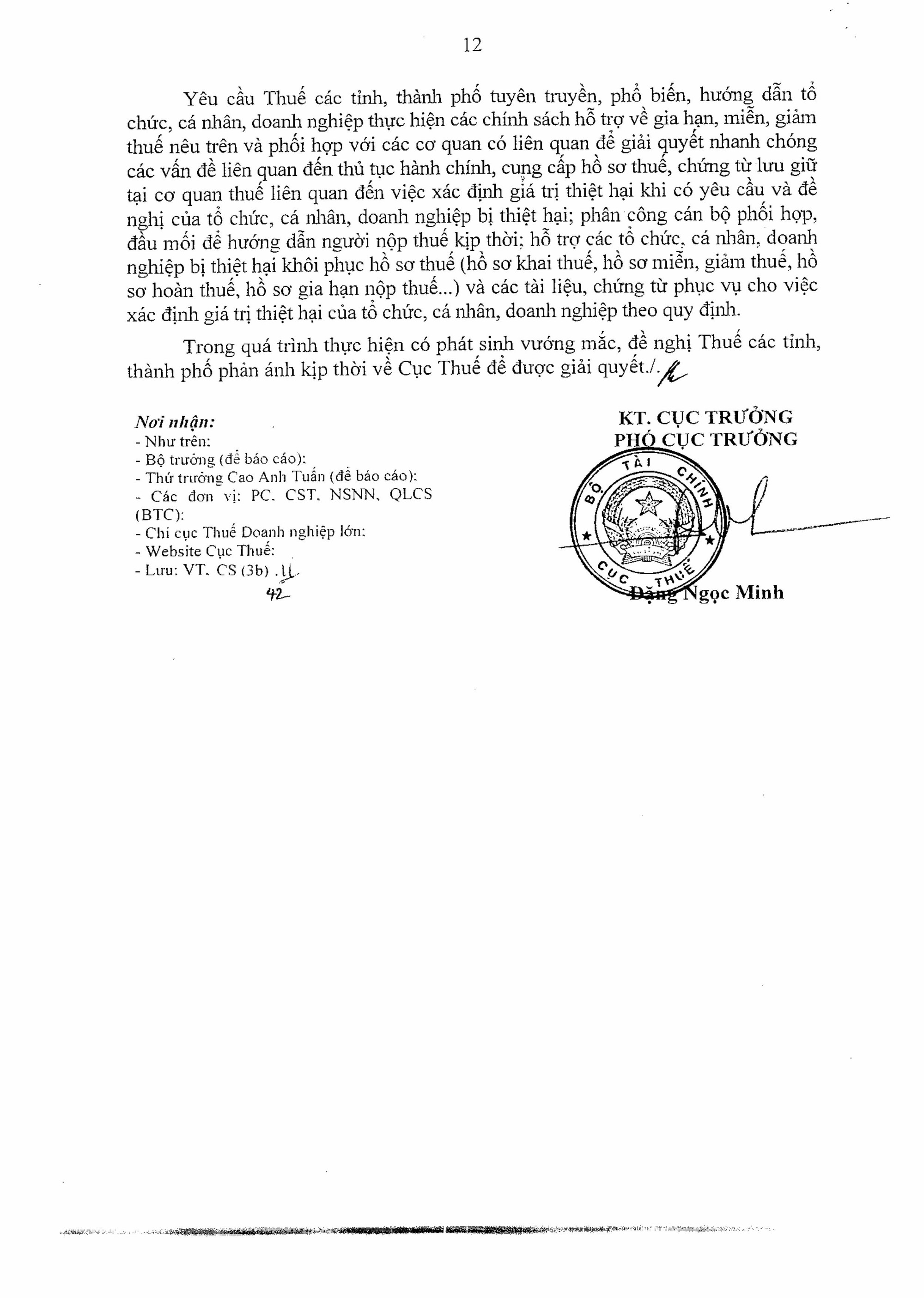Cục Thuế yêu cầu Thuế các tỉnh, thành phố tuyên truyền, phổ biến, hướng dẫn tổ chức, cá nhân, doanh nghiệp thực hiện chính sách hỗ trợ về gia hạn, miễn, giảm thuế nêu trên và phối hợp với các cơ quan có liên quan để giải quyết nhanh chóng các vấn đề liên quan đến thủ tục hành chính, cung cấp hồ sơ thuế, chứng từ lưu giữ tại cơ quan thuế liên quan đến việc xác định giá trị thiệt hại; phân công cán bộ phối hợp, đầu mối để hướng dẫn người nộp thuế kịp thời; hỗ trợ các tổ chức, cá nhân, doanh nghiệp bị thiệt hại khôi phục hồ sơ thuế (hồ sơ khai thuế, hồ sơ miễn, giảm thuế, hồ sơ hoàn thuế, hồ sơ gia hạn nộp thuế...) và các tài liệu, chứng từ phục vụ cho việc xác định giá trị thiệt hại của tổ chức, cá nhân, doanh nghiệp theo quy định.