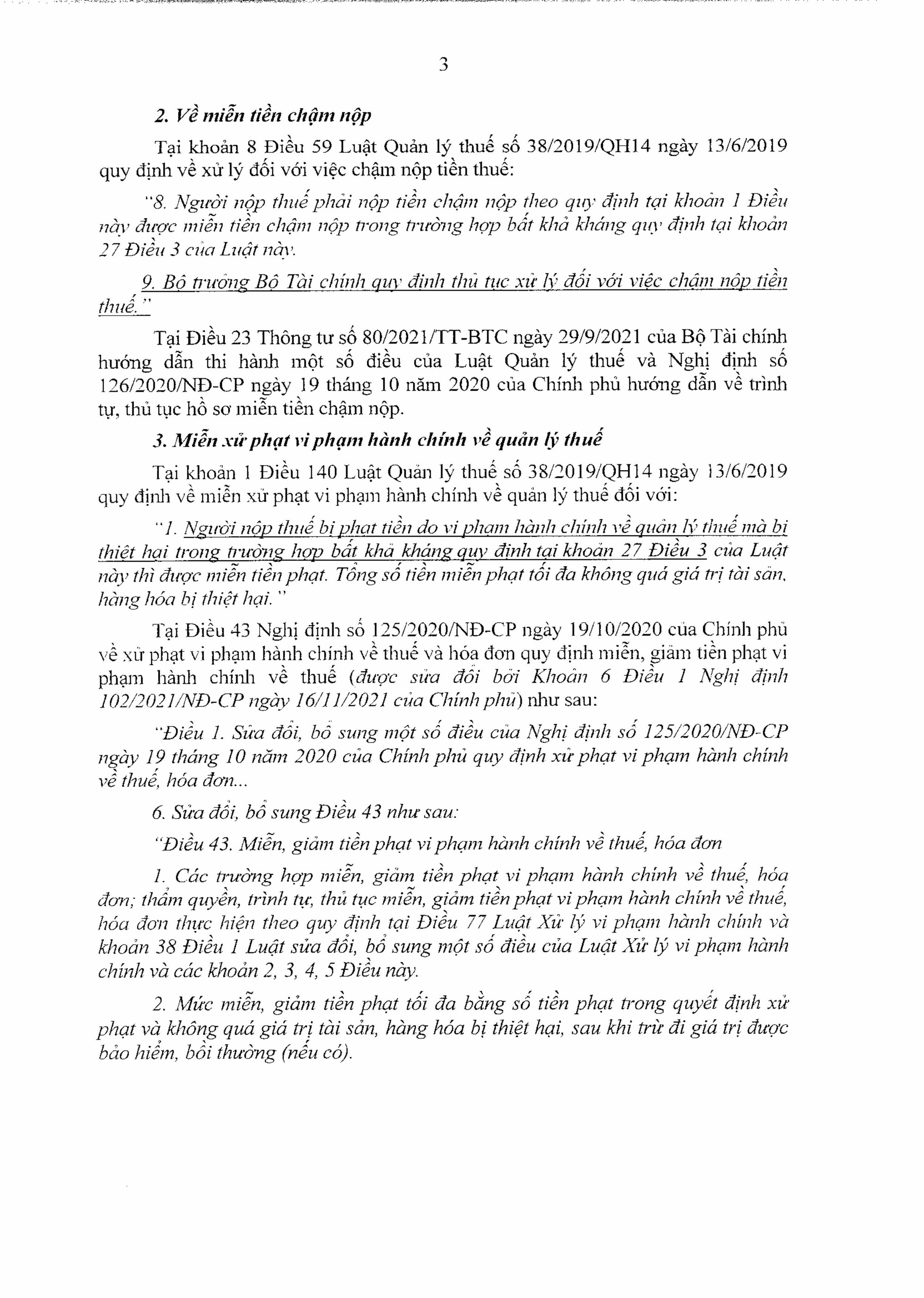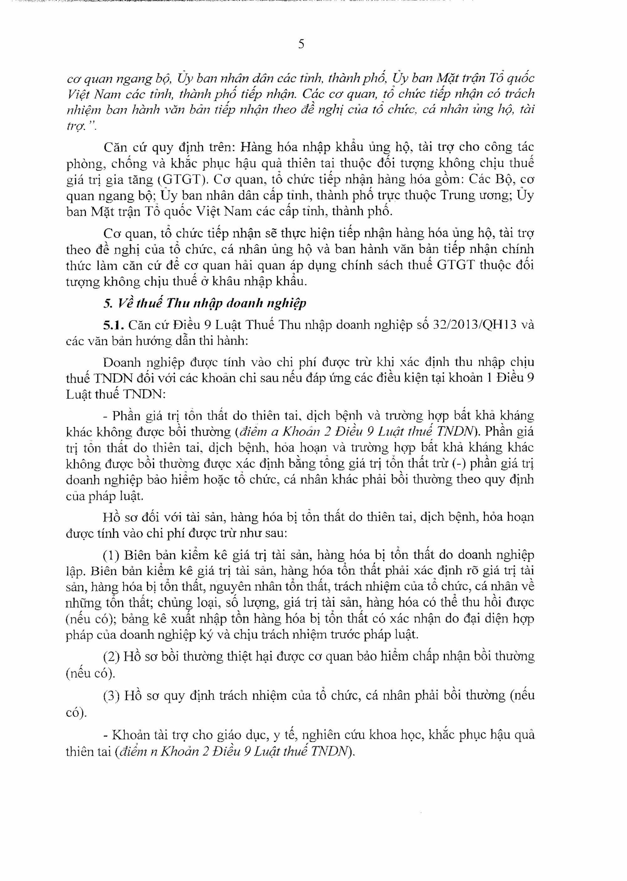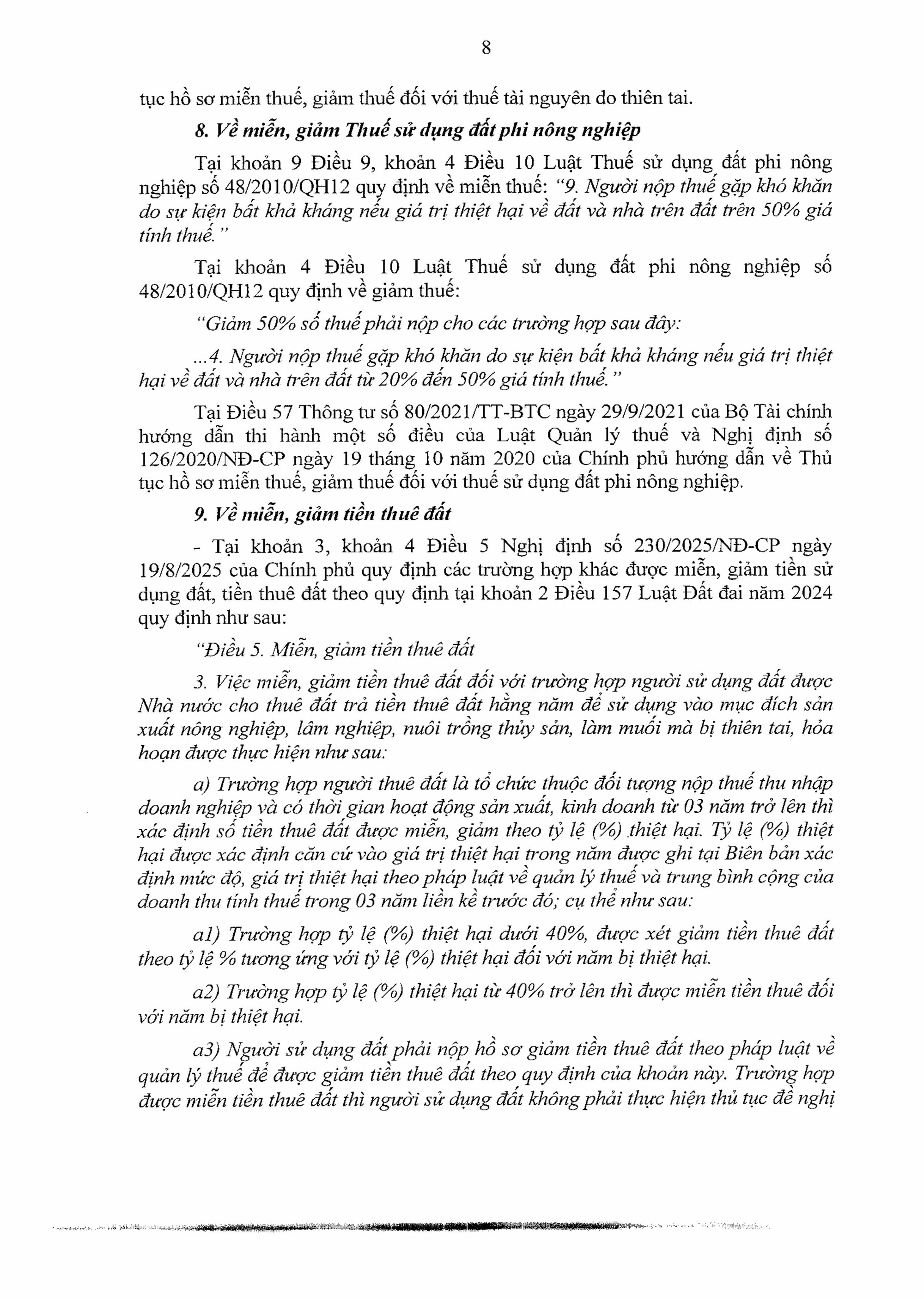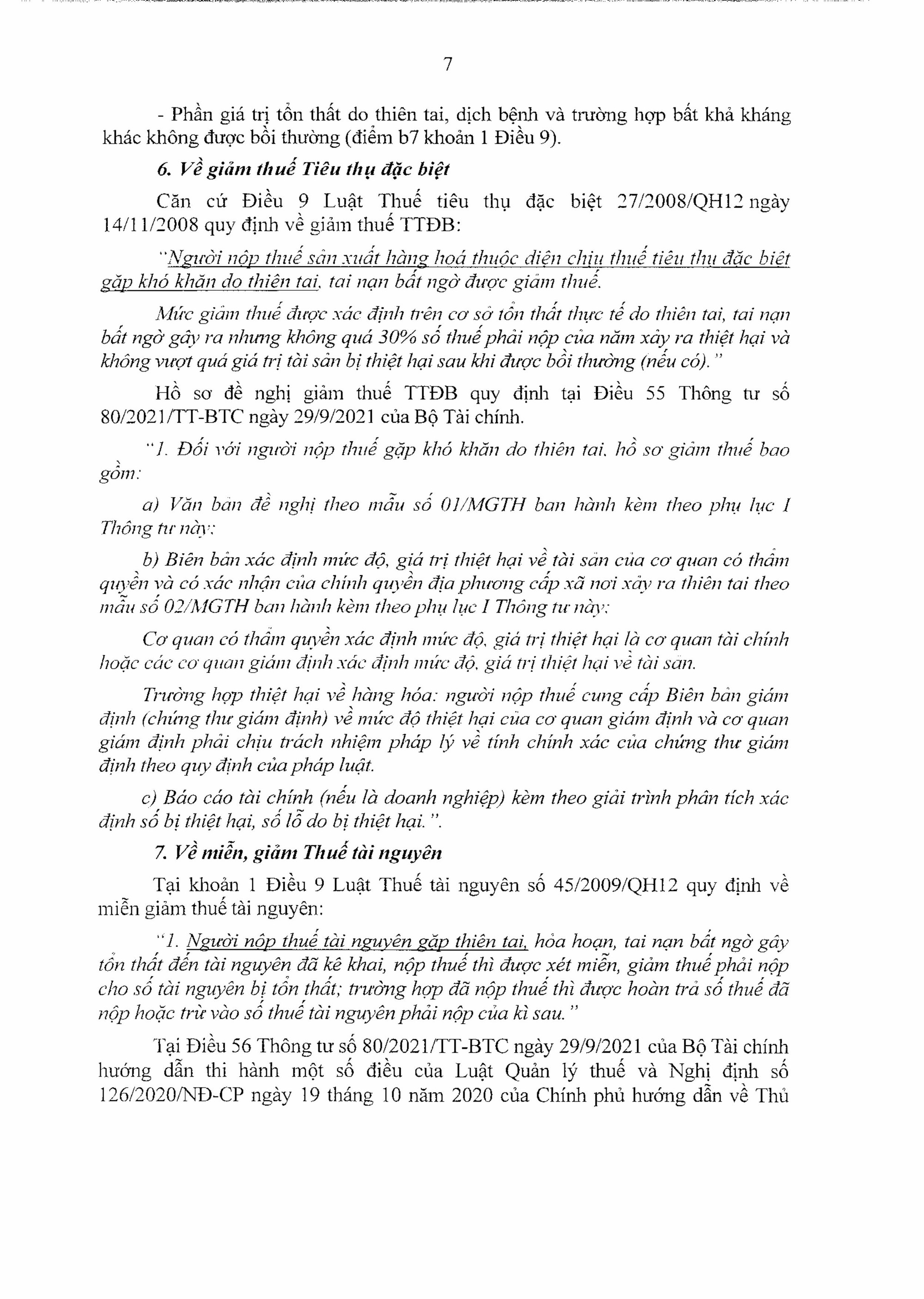 Thứ nhất, quy định của pháp luật về miễn, giảm, gia hạn thuế, chính sách thuế cho doanh nghiệp, tổ chức bị ảnh hưởng do gặp thiên tai (gồm các nội dung: Gia hạn nộp thuế; miễn tiền chậm nộp; miễn xử phạt vi phạm hành chính về quản lý thuế; về khấu trừ thuế giá trị gia tăng; về thuế thu nhập doanh nghiệp; giảm thuế Tiêu thụ đặc biệt; miễn, giảm Thuế tài nguyên; miễn giảm Thuế sử dụng đất phi nông nghiệp; miễn, giảm tiền thuê đất).
