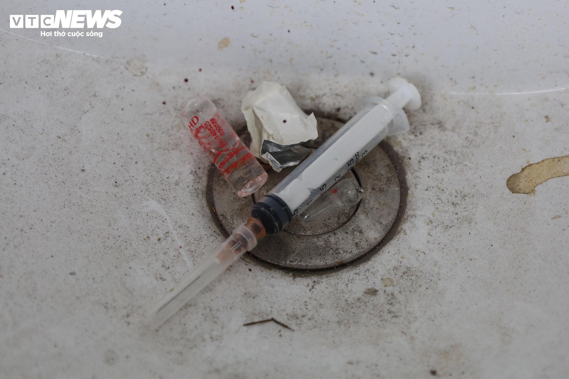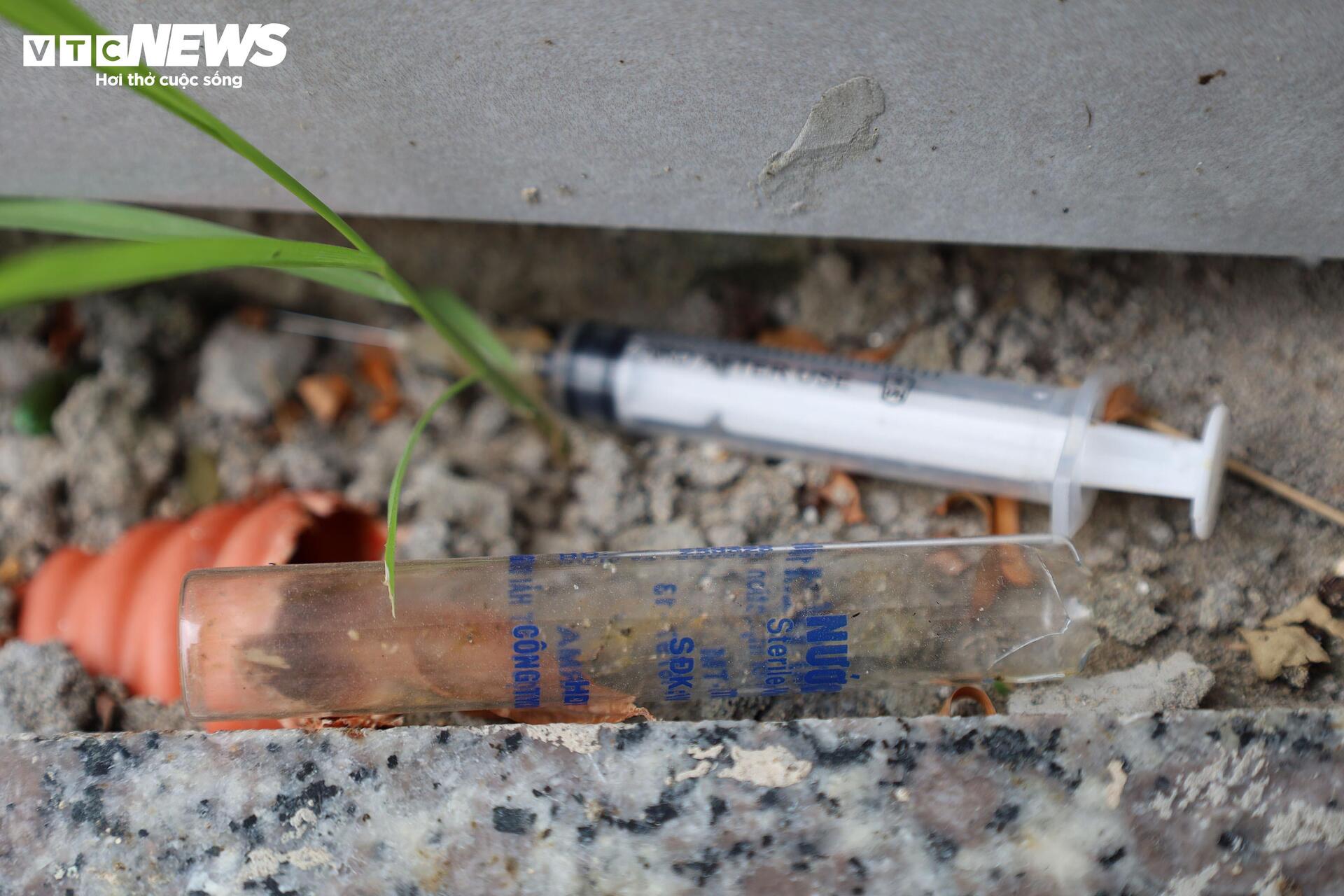 Khu vực nhà vệ sinh bị biến thành "bãi đáp" cho con nghiện, dấu hiệu để lại là những chiếc bơm kim tiêm và lọ thủy tinh vứt xung quanh, khiến người dân vô cùng lo lắng mỗi khi đi dạo hay tập thể dục ở đây.