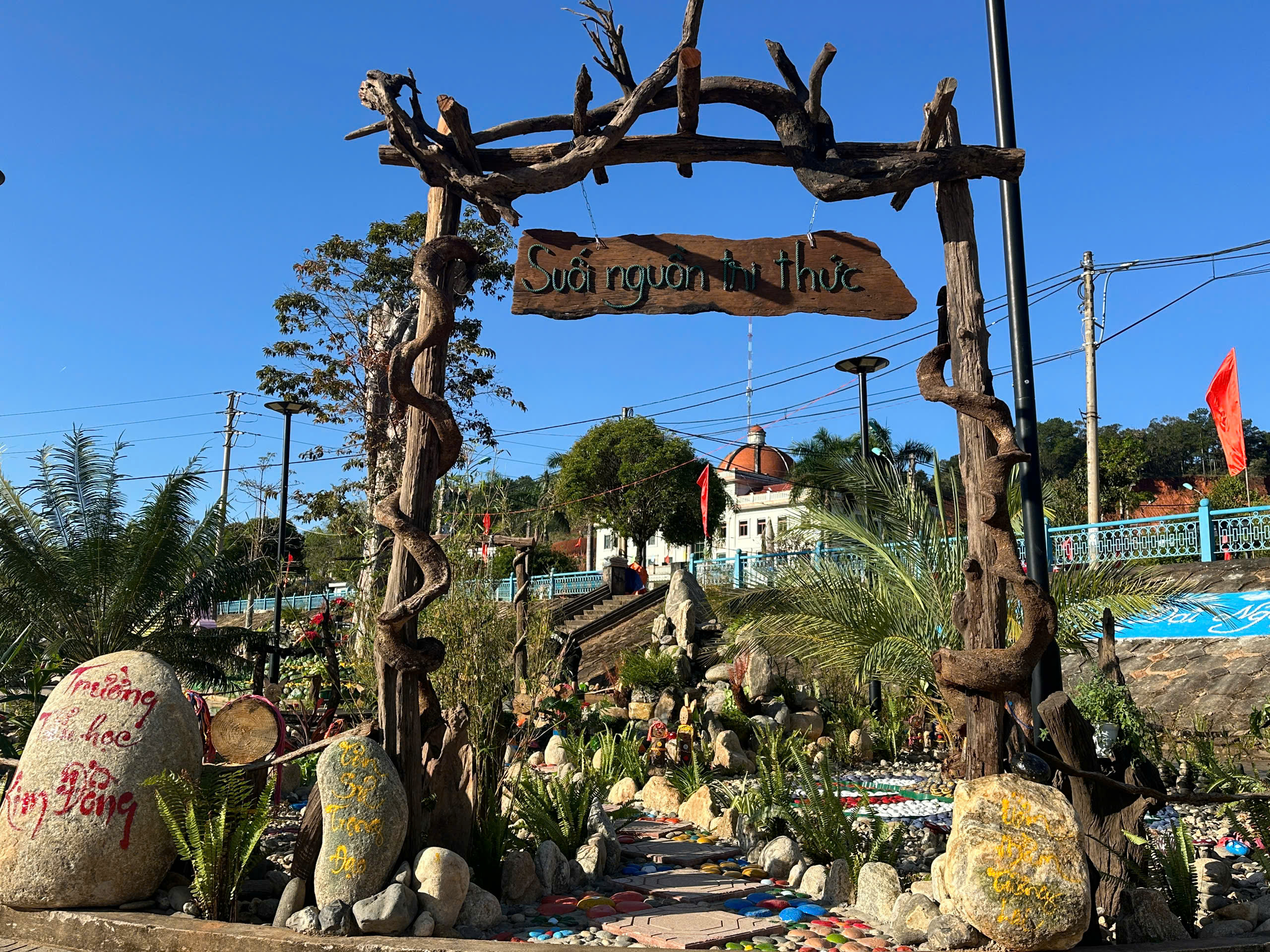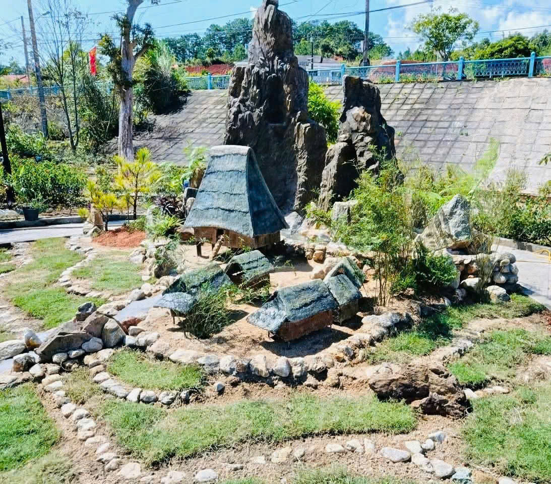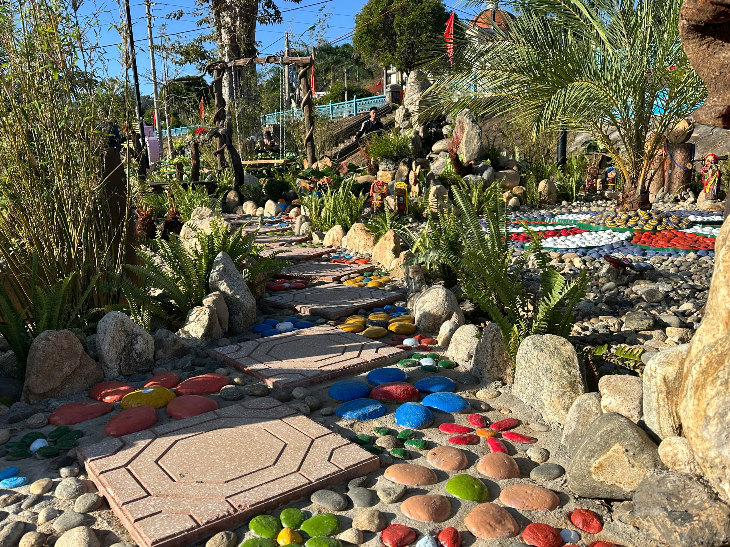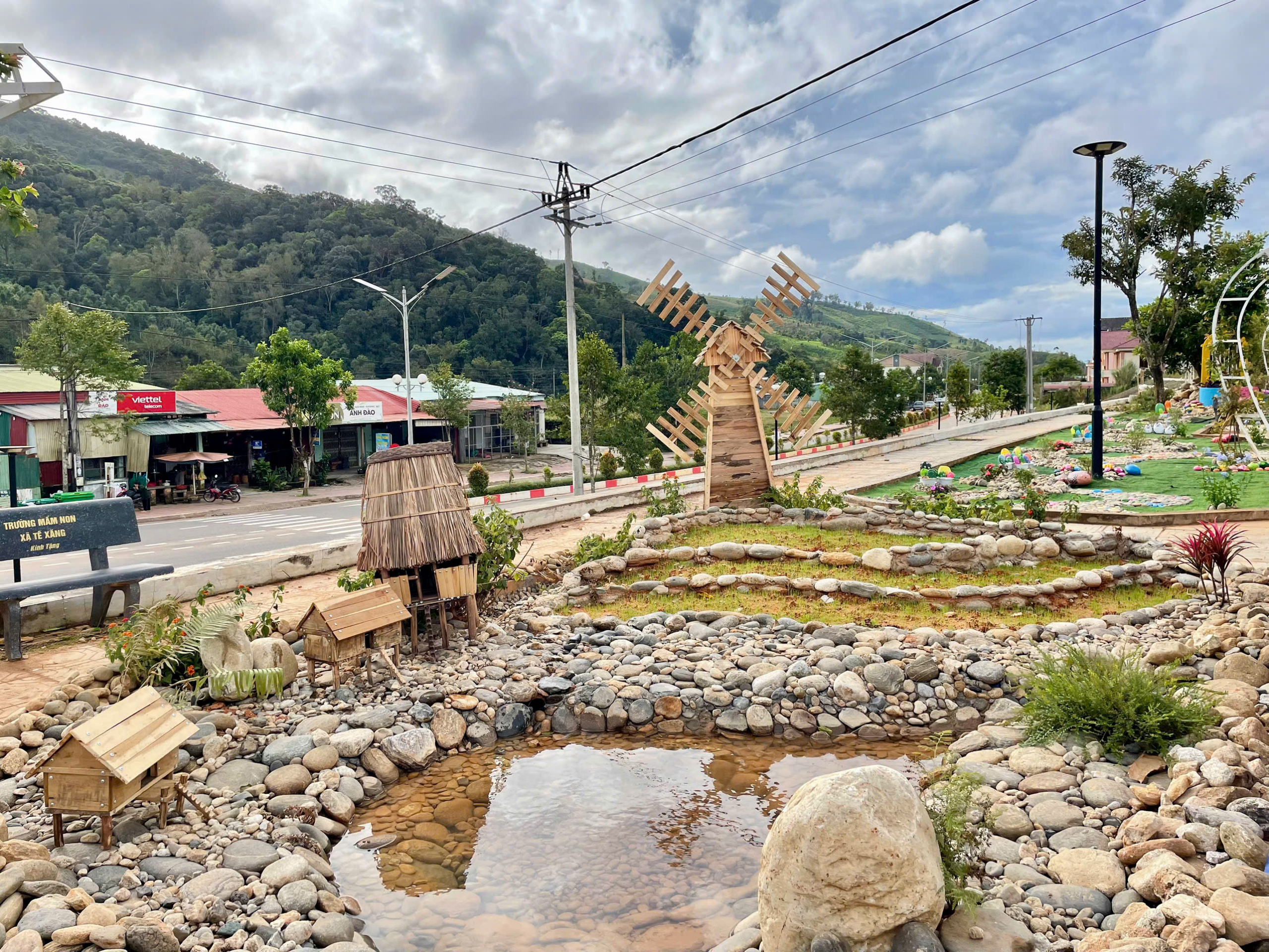 Một góc nghệ thuật do giáo viên, học sinh xây dựng từ đá và gỗ
