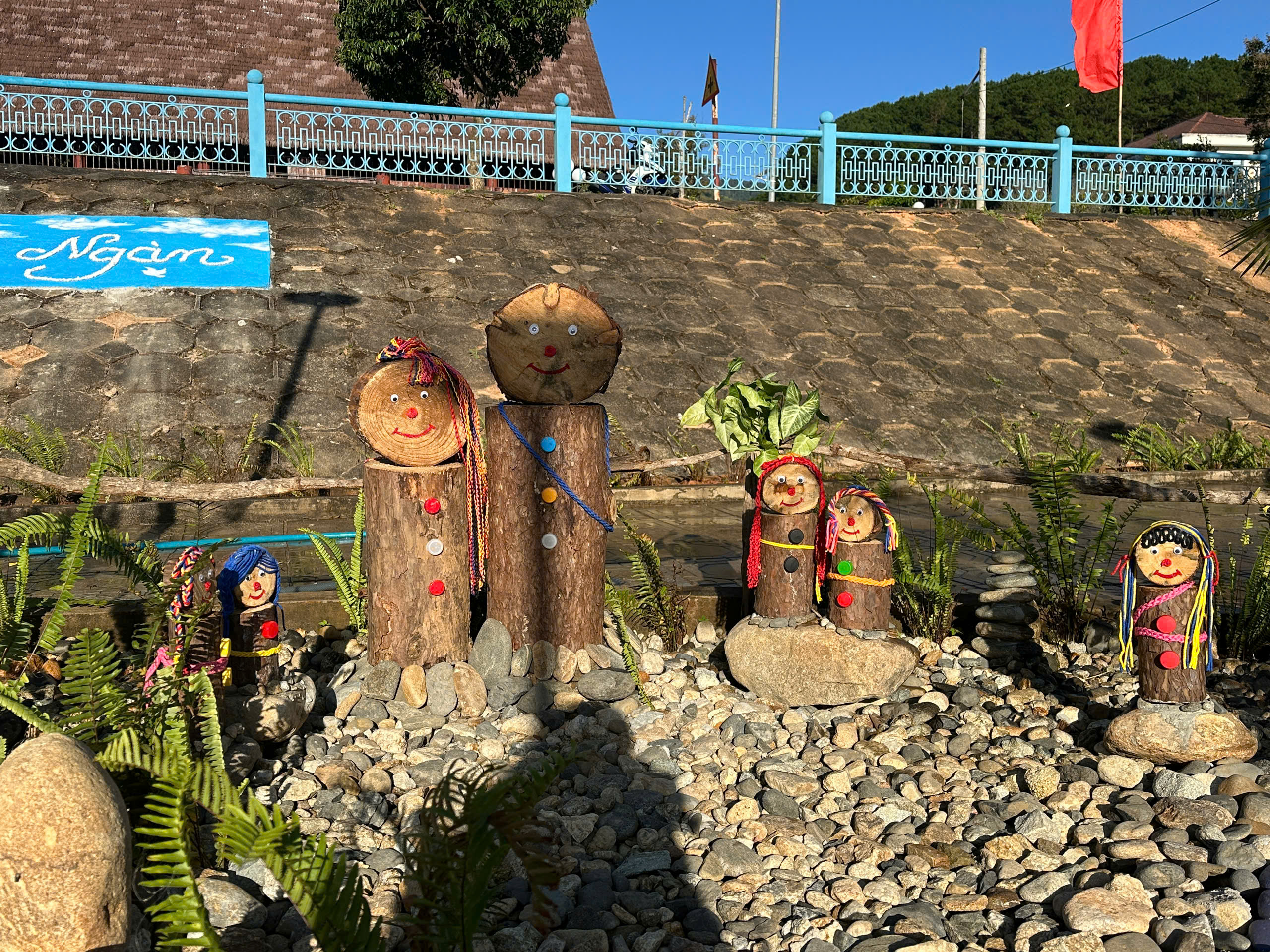 Những khúc gỗ được trang trí thành hình các em học sinh