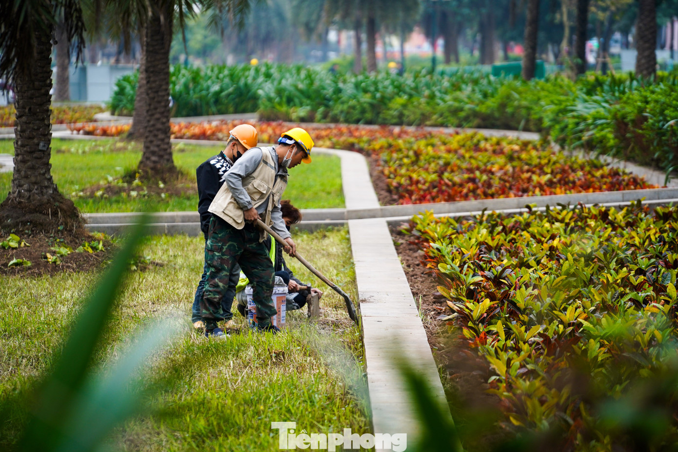 Công nhân chăm sóc, cắt tỉa thảm cỏ trong khuôn viên công viên.