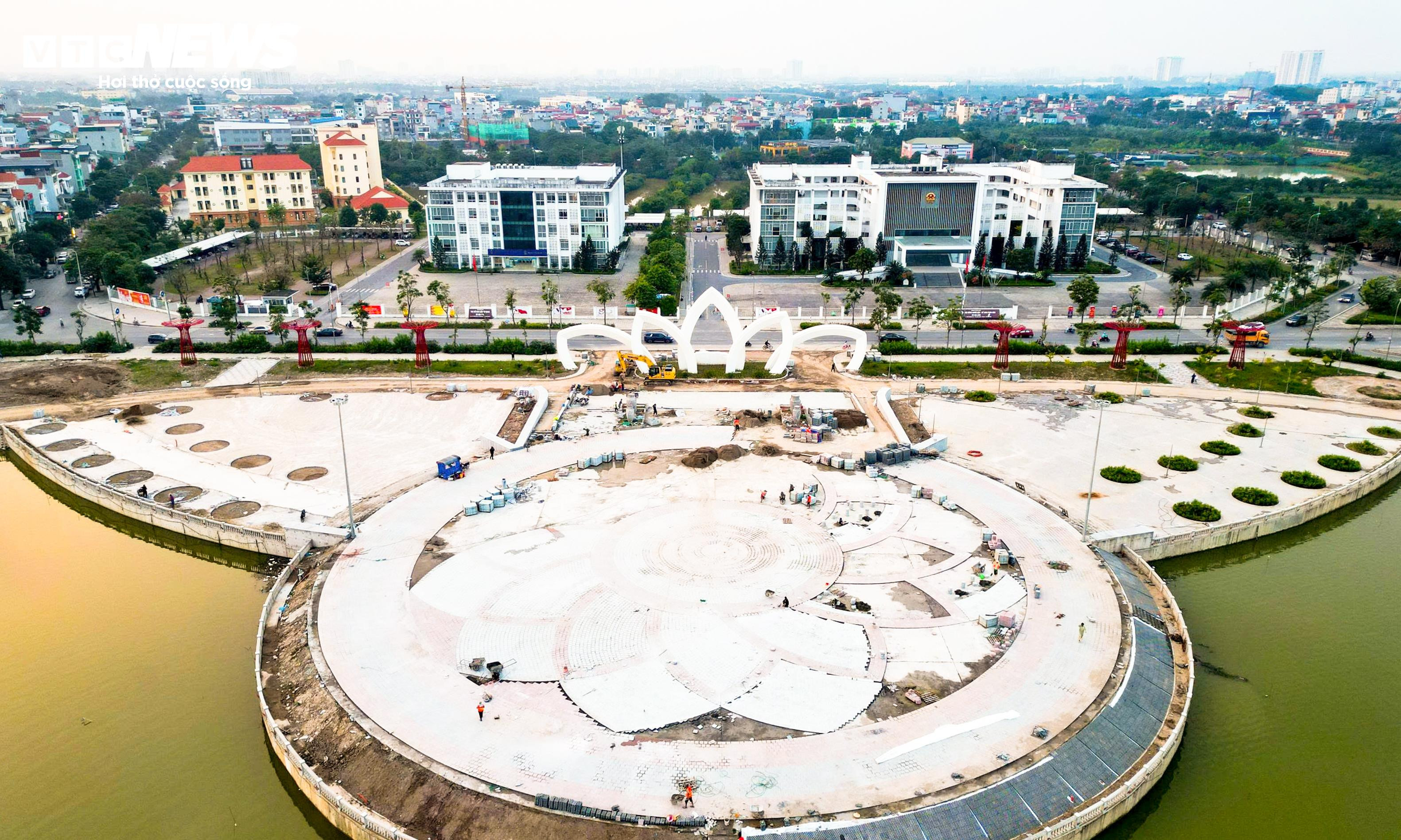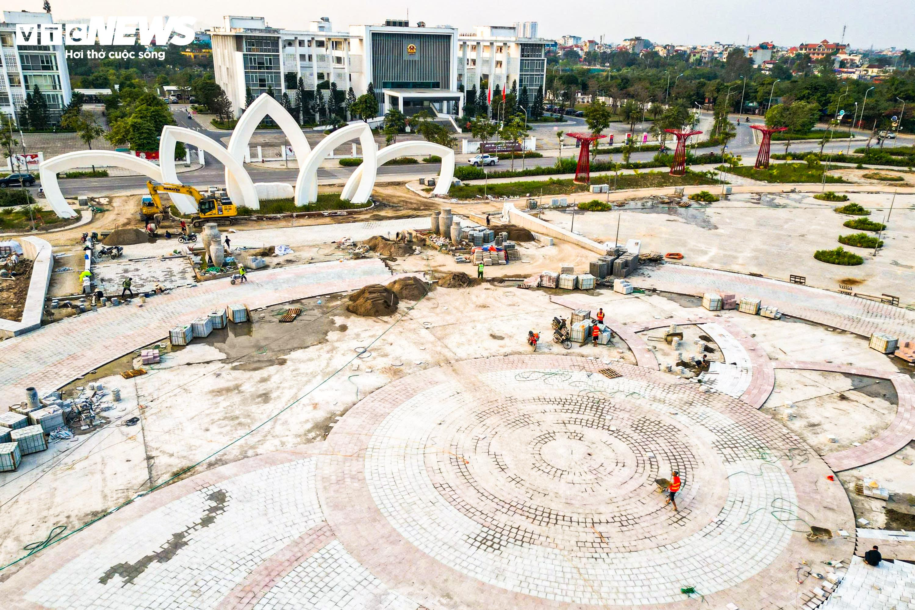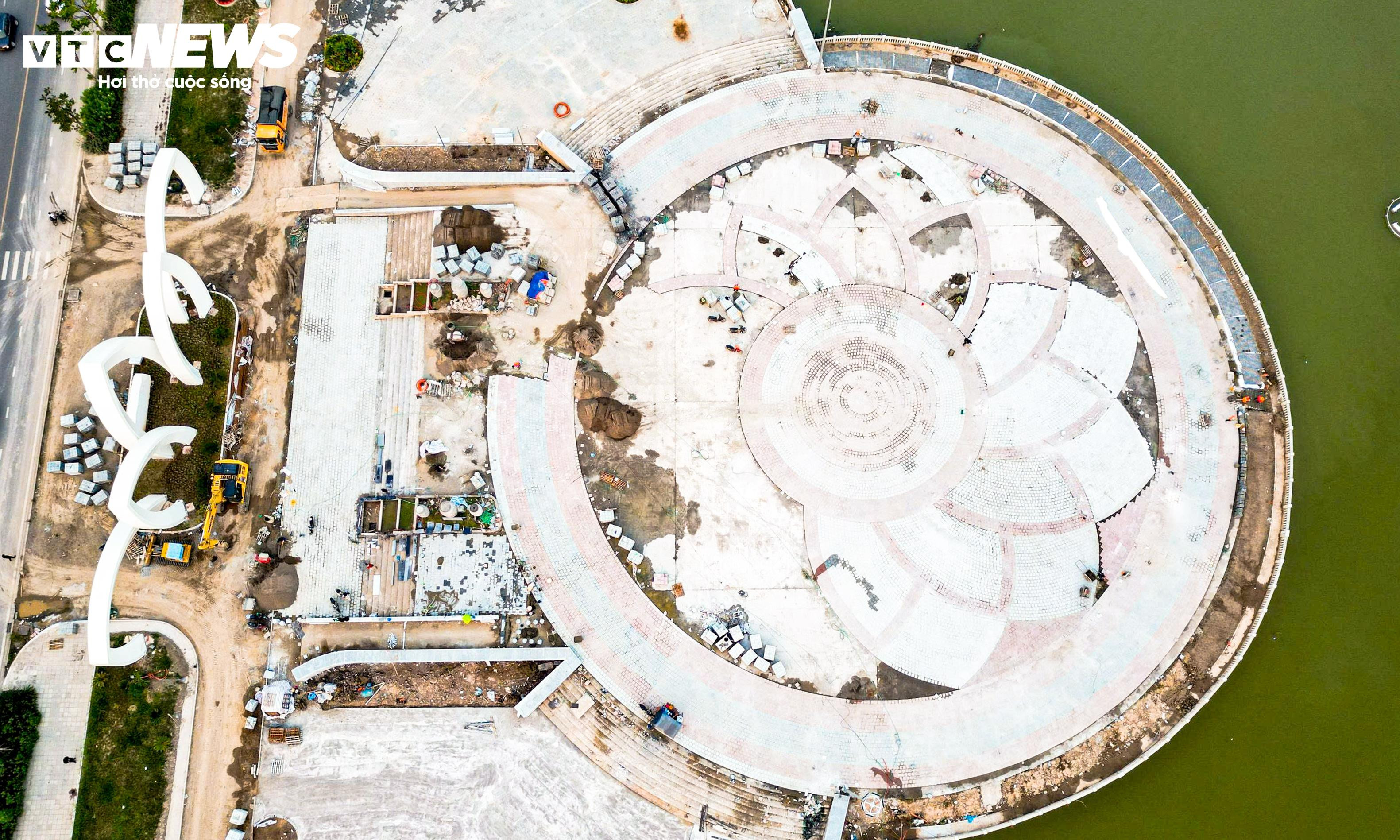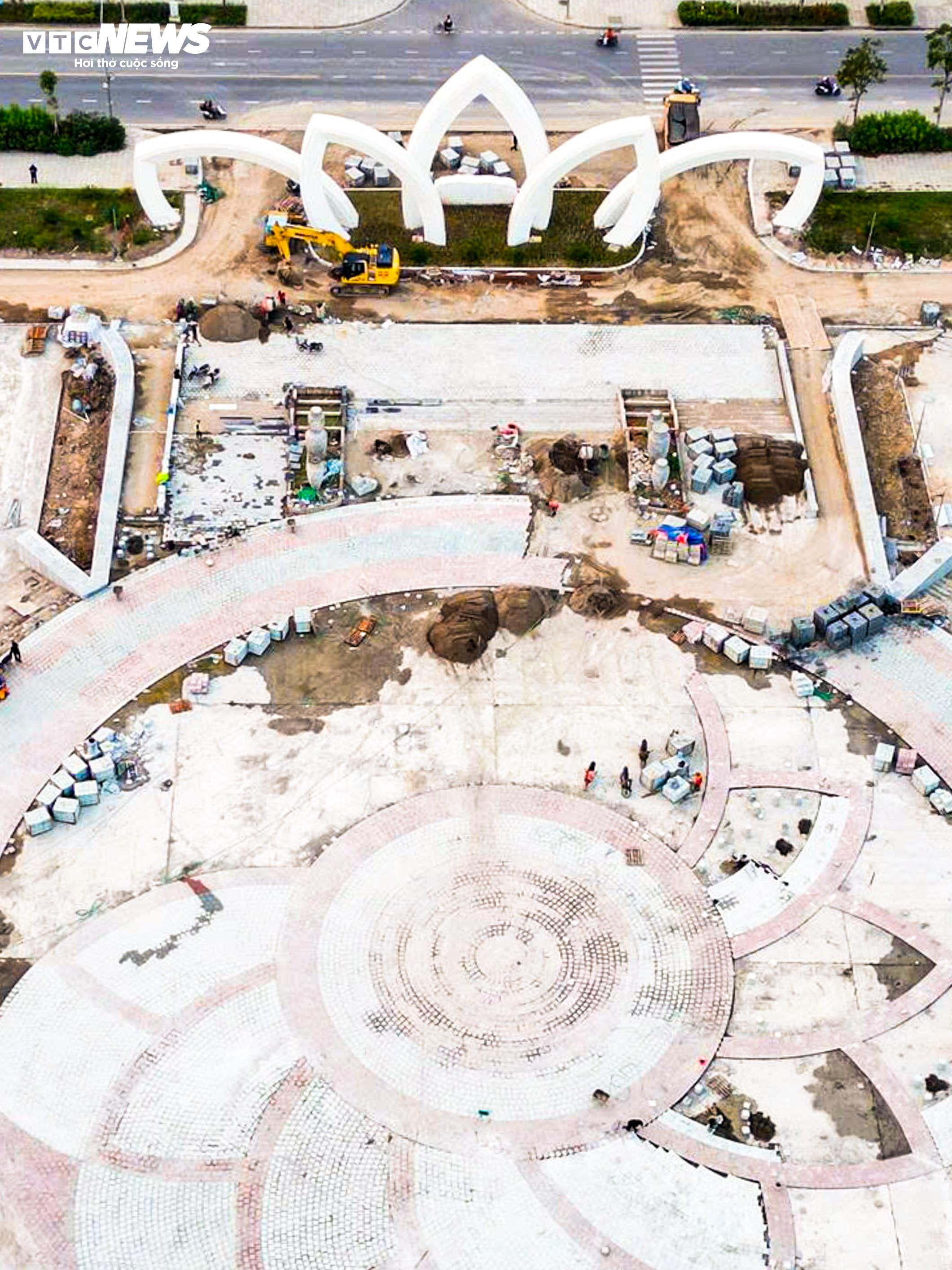 Hàng chục công nhân được huy động để hoàn thiện các hạng mục còn lại như lát gạch đường dạo, đổ bê tông một số khu vực quảng trường, lắp đặt hệ thống chiếu sáng và hạ tầng kỹ thuật.