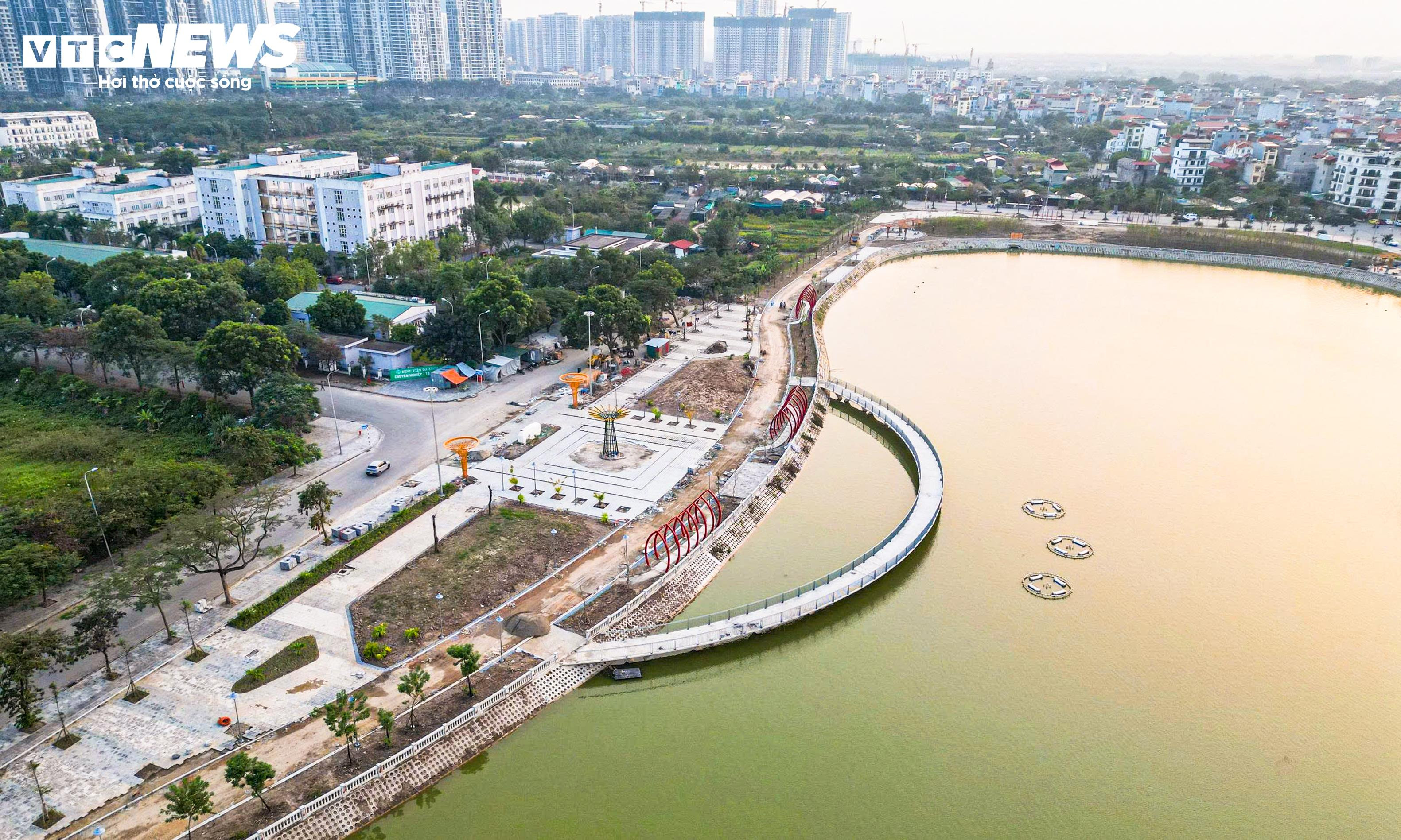 Bên trong công viên, cầu đi bộ bắc qua hồ điều hòa đã lộ diện, tạo điểm nhấn cảnh quan và kết nối các không gian chức năng.