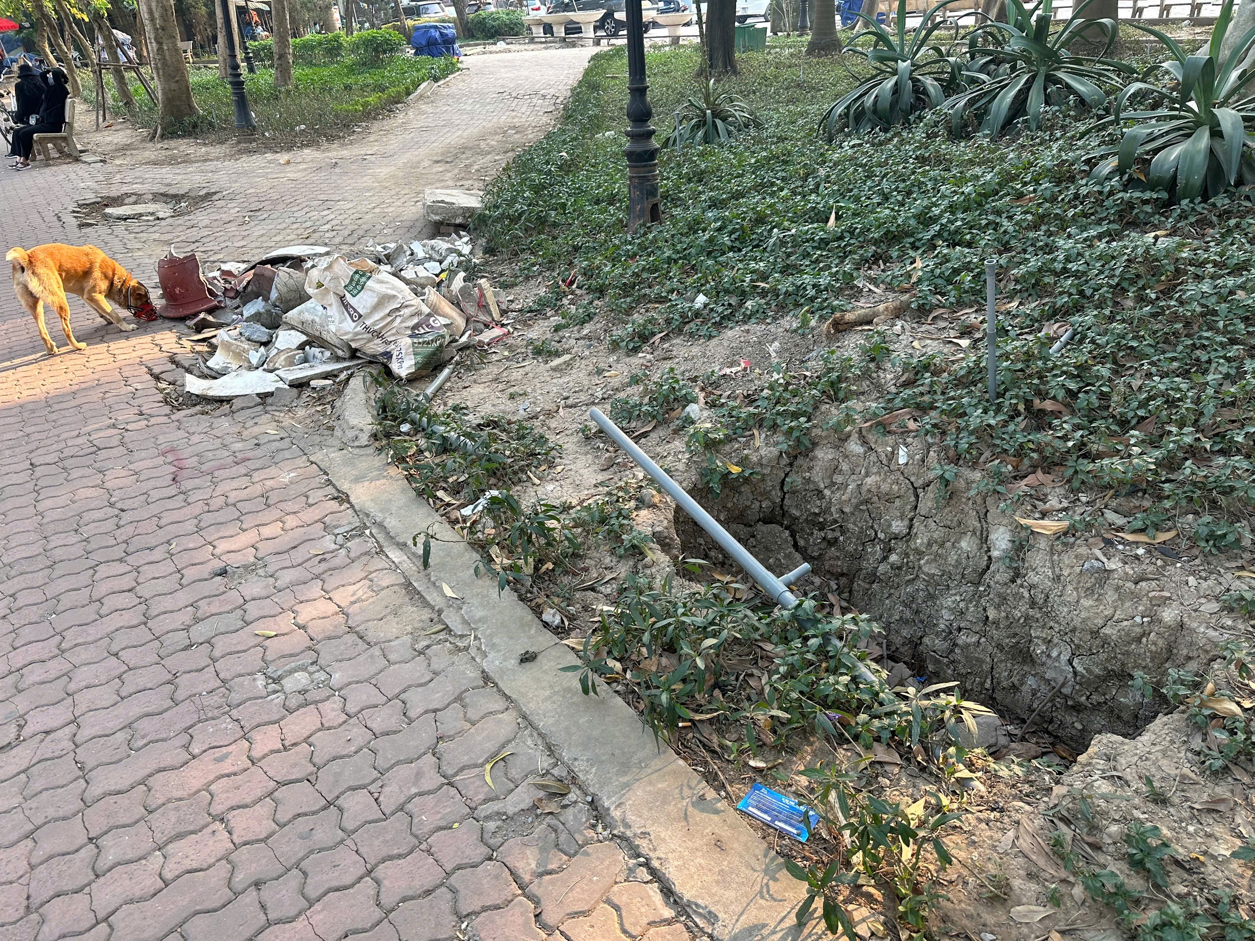 Phế liệu vứt bừa bãi, ngổn ngang. Song song với đó là chó được thả đi lại tự do trong công viên.