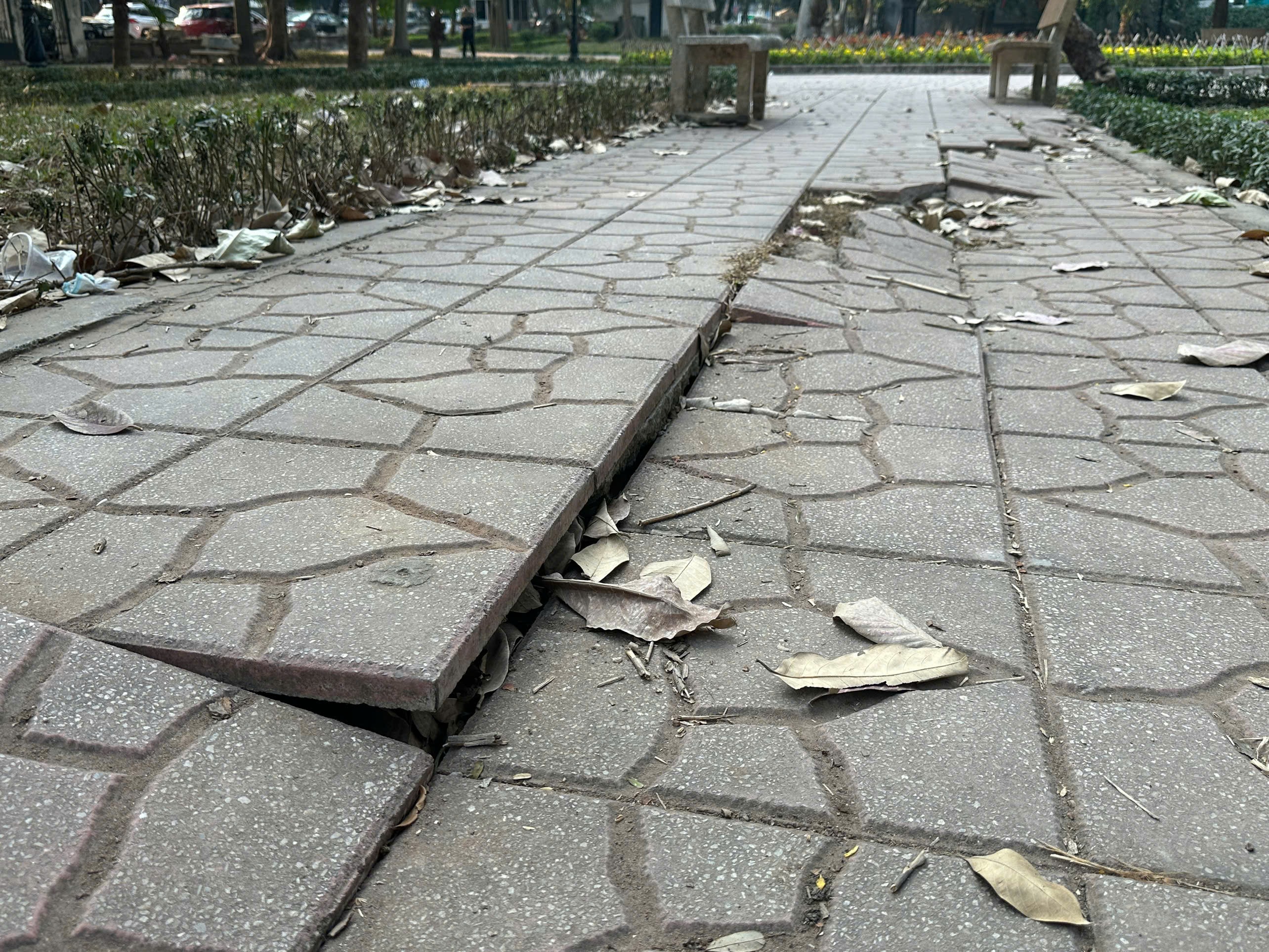 Nền gạch vỡ, gồ ghề gây nguy hiểm cho người dân và trẻ nhỏ khi tham gia tập luyện, giải trí.