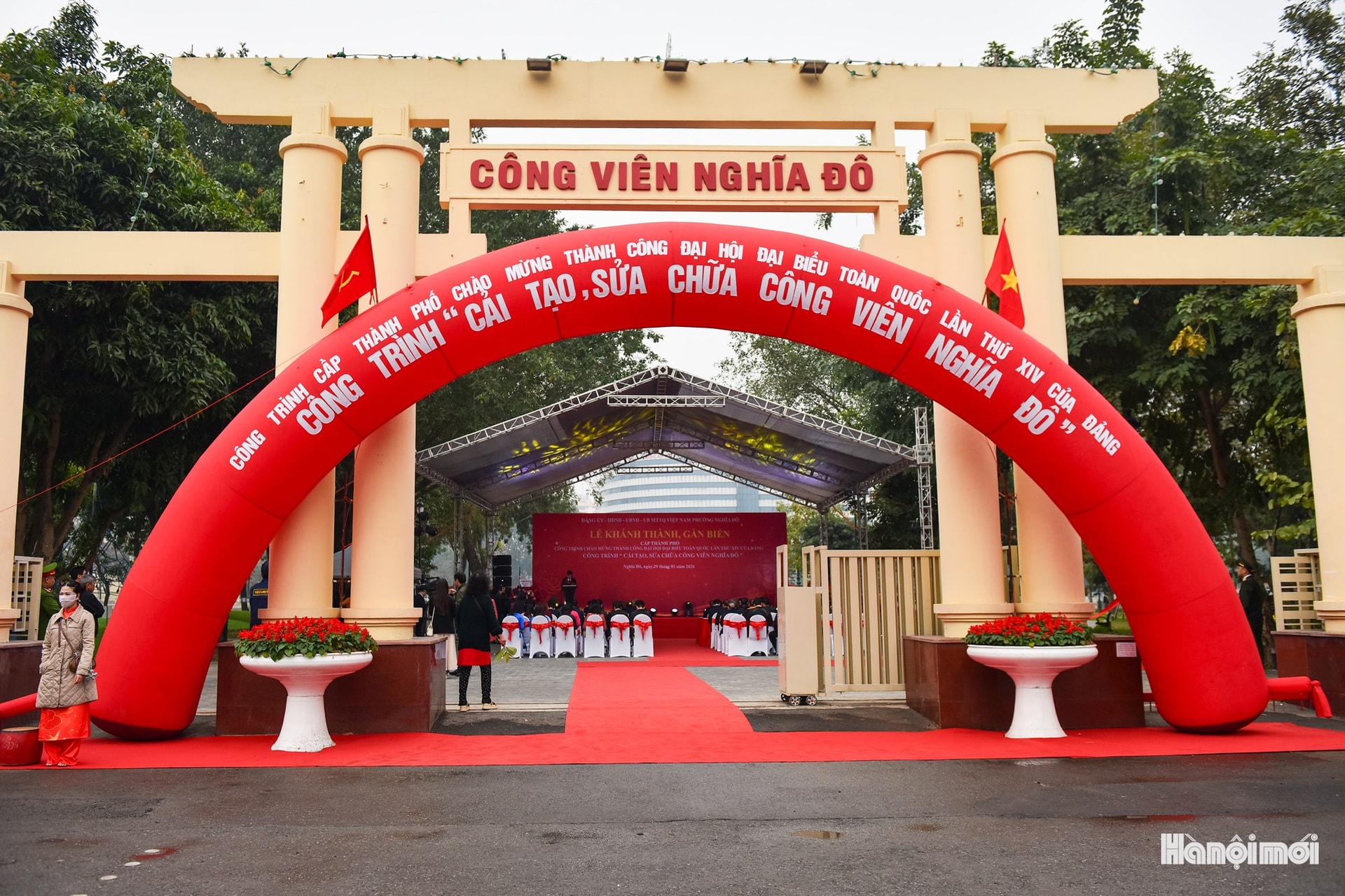 Cổng chính công viên Nghĩa Đô trong lễ khánh thành công trình cấp thành phố chào mừng thành công Đại hội XIV của Đảng.