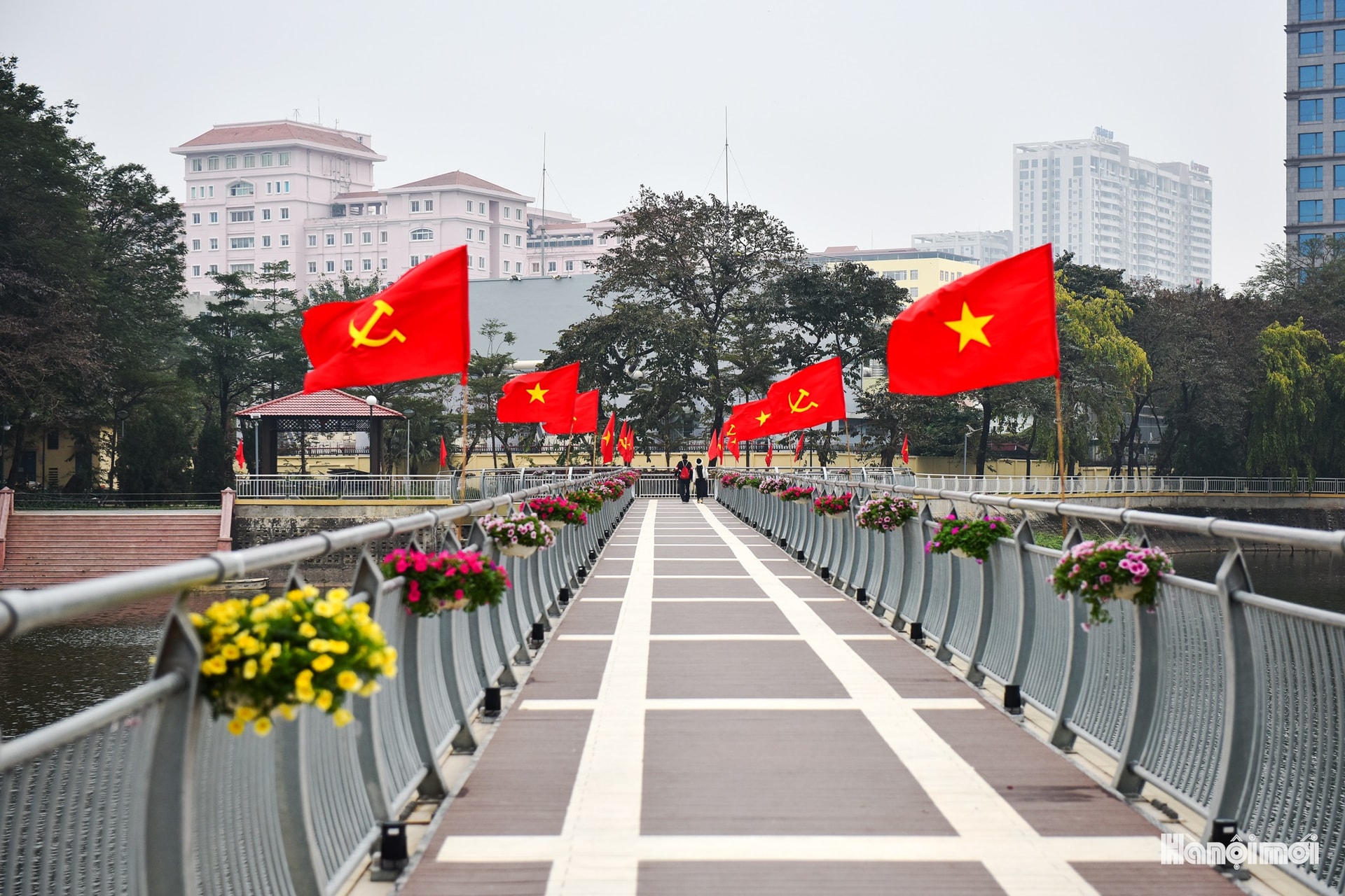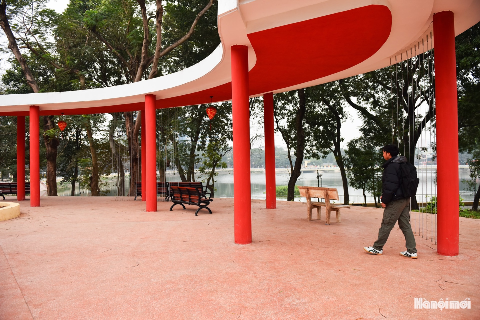 Cây cầu uốn lượn như cây đàn giữa hồ, vừa là lối đi, vừa là biểu tượng nghệ thuật của công viên.