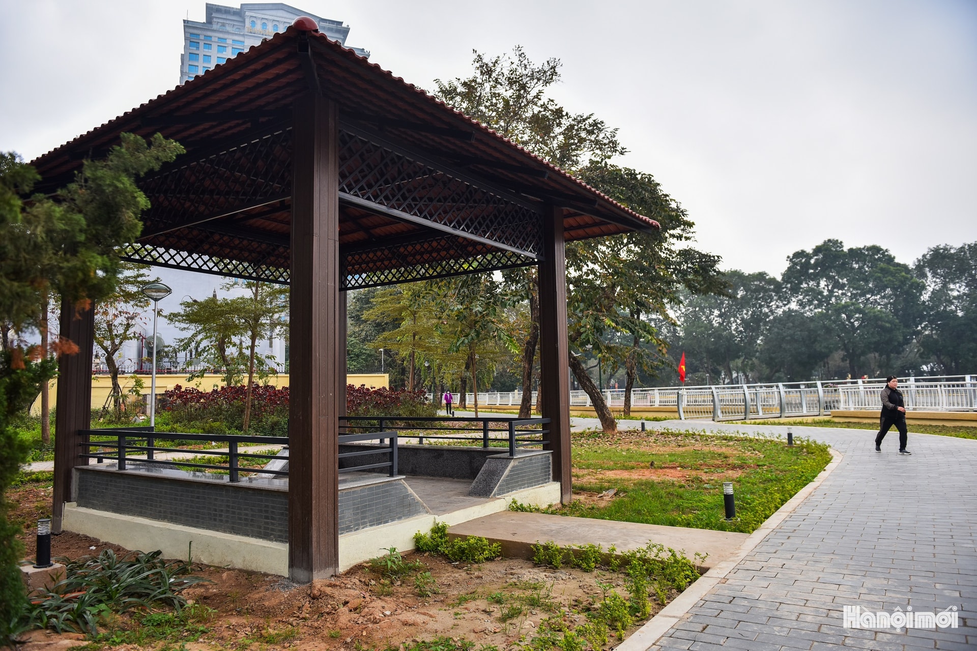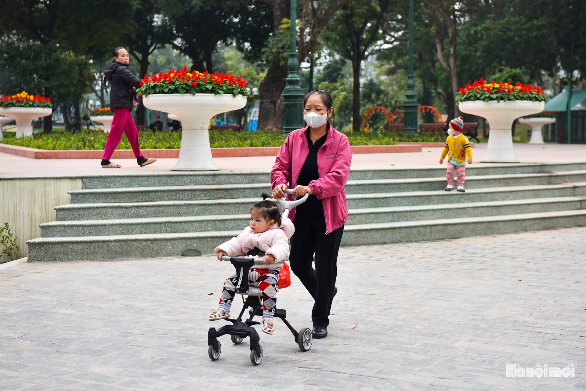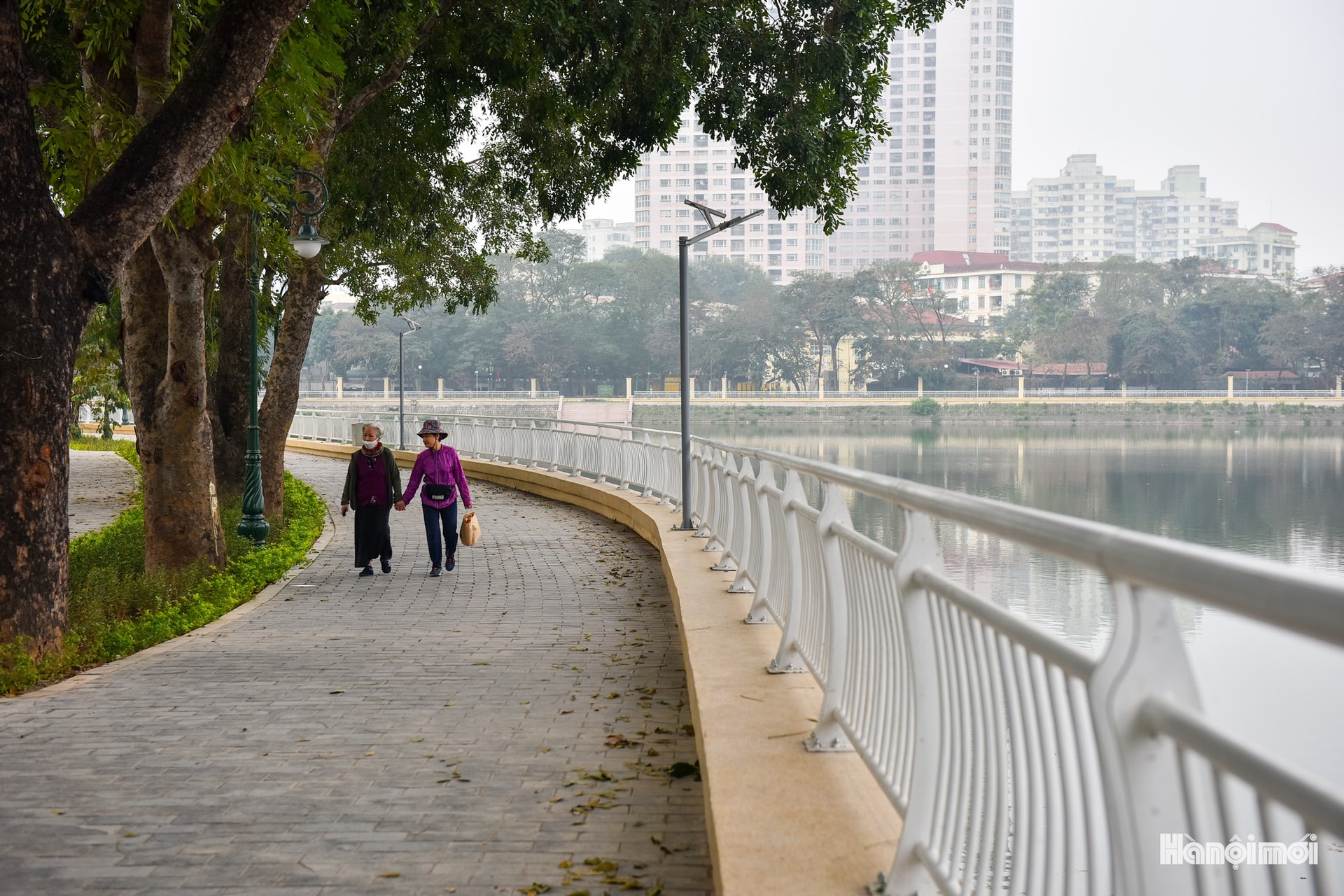 Những bước chân đầu tiên trên lối đi lát đá mới - niềm háo hức của cư dân khi trở lại công viên sau cải tạo.