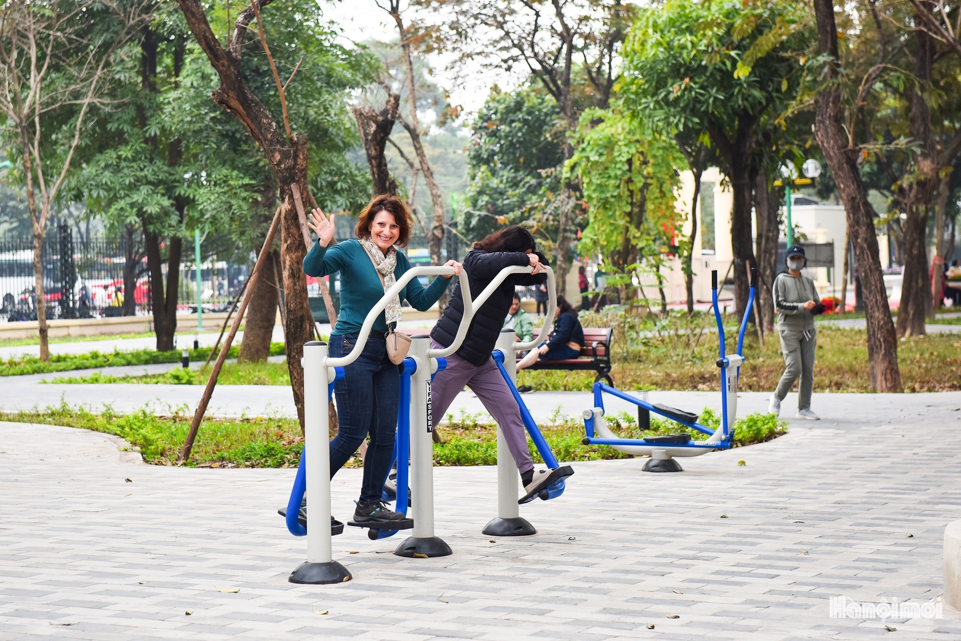 Người nước ngoài cùng người dân Hà Nội tập thể dục trong công viên, tạo nên không gian sinh hoạt công cộng đa văn hóa, gần gũi và cởi mở.