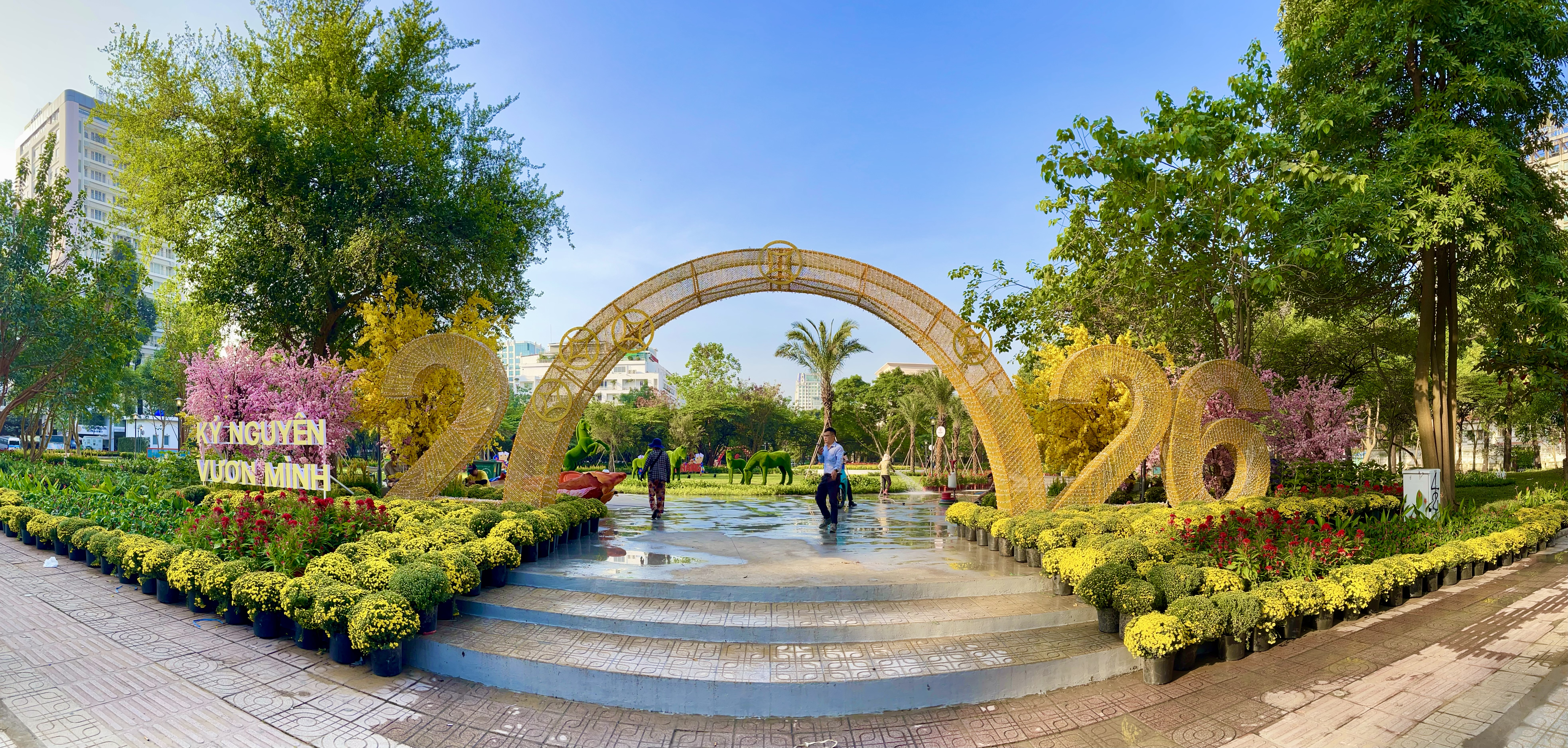 Nổi bật ngay cổng chính trên đường Pasteur là khu trang trí đón xuân với vòm chào lớn, sắc vàng rực rỡ cùng các tiểu cảnh hoa kiểng, thu hút người dân đến tham quan, chụp ảnh lưu niệm.