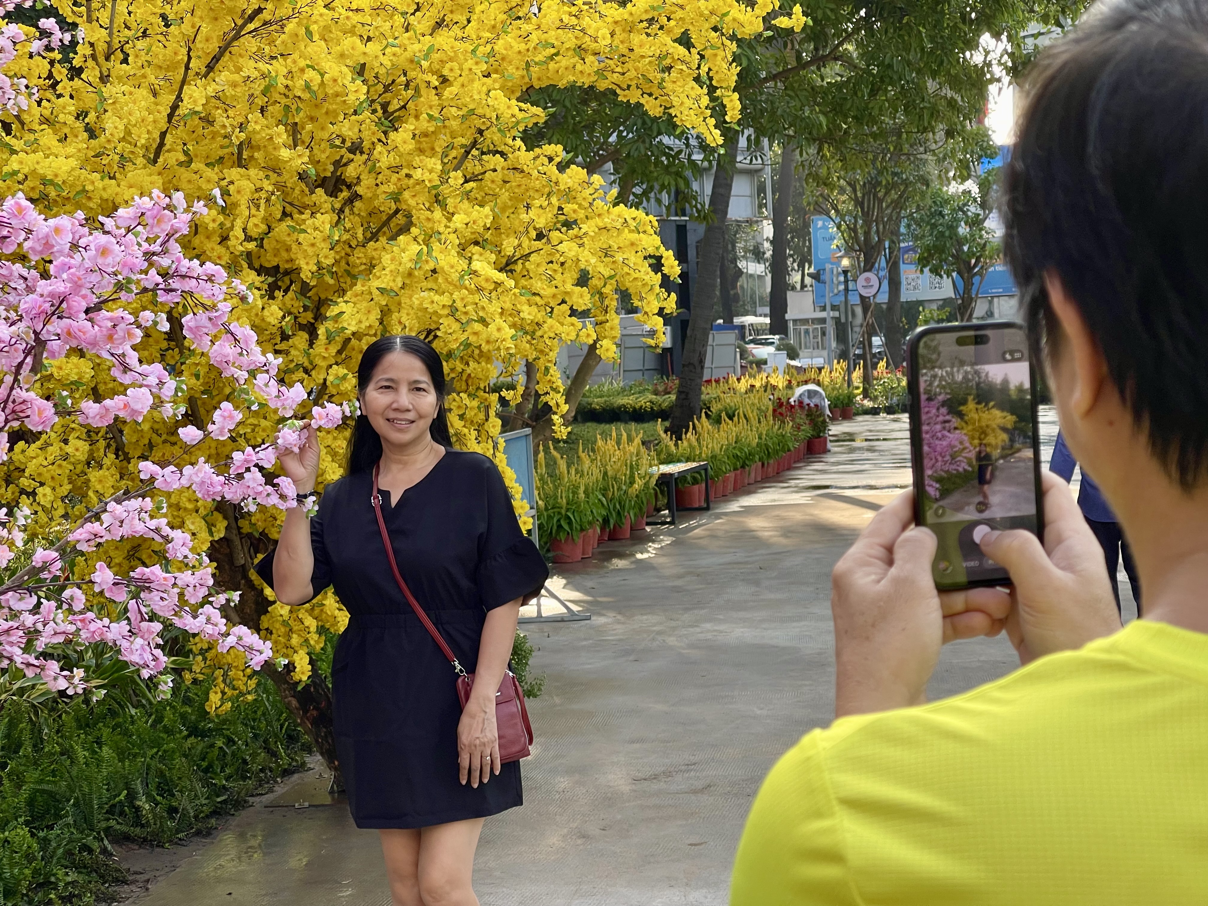 Người dân tranh thủ chụp ảnh lưu niệm bên các tiểu cảnh hoa xuân. Ảnh: HOÀNG HÙNG