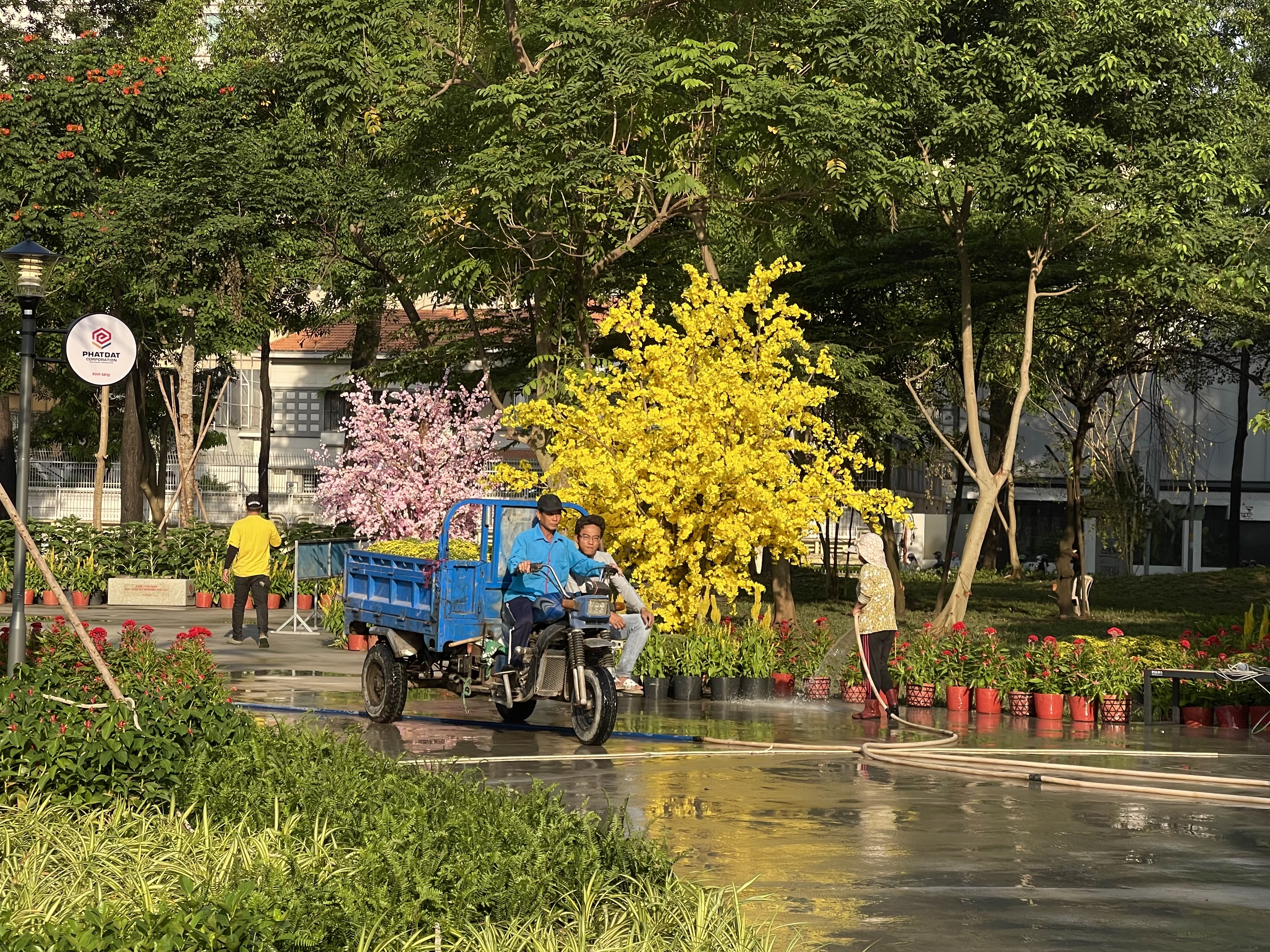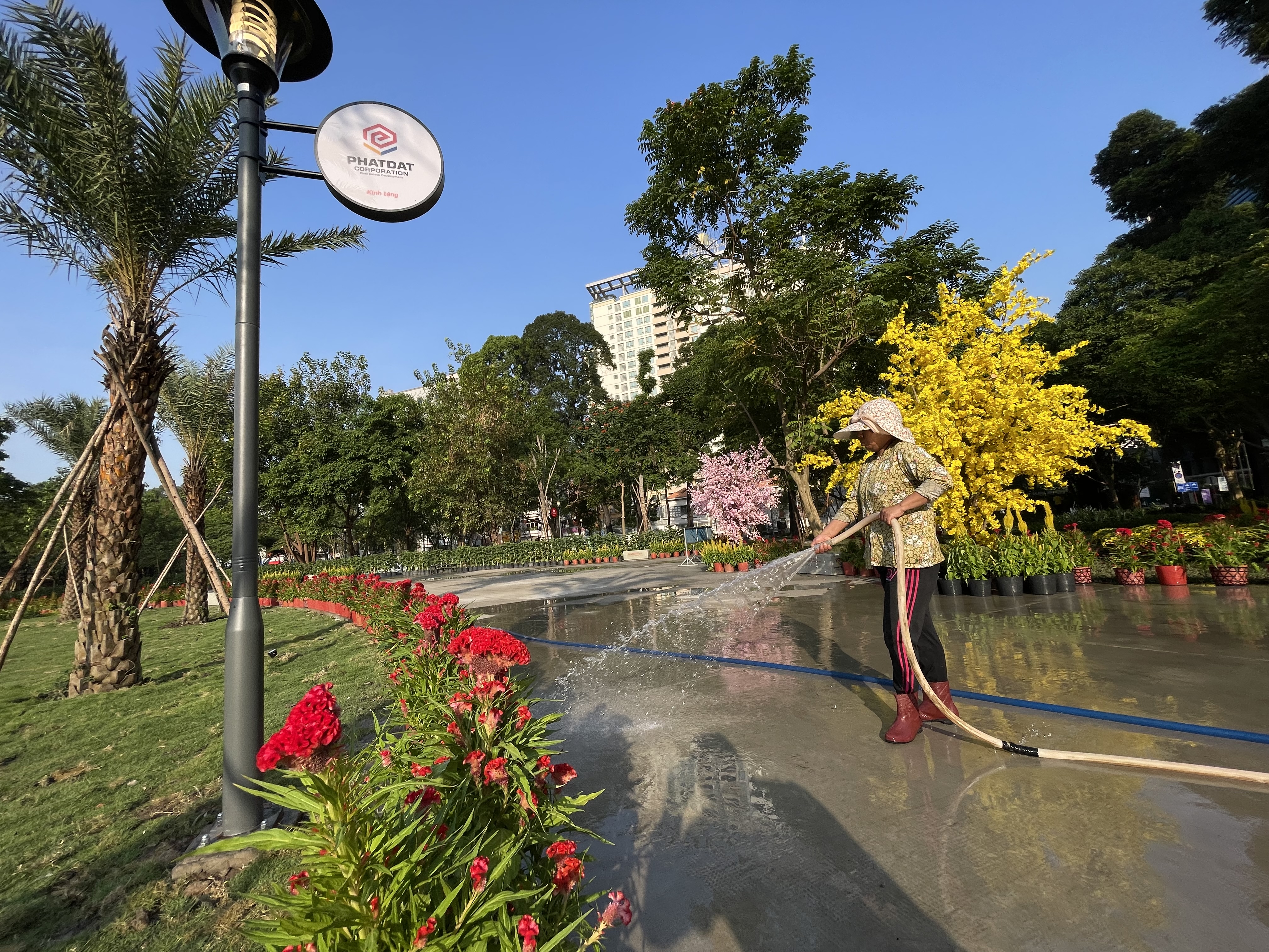 Công nhân tưới nước chăm sóc hoa, hoàn thiện những hạng mục cuối trước giờ bàn giao. Ảnh: HOÀNG HÙNG