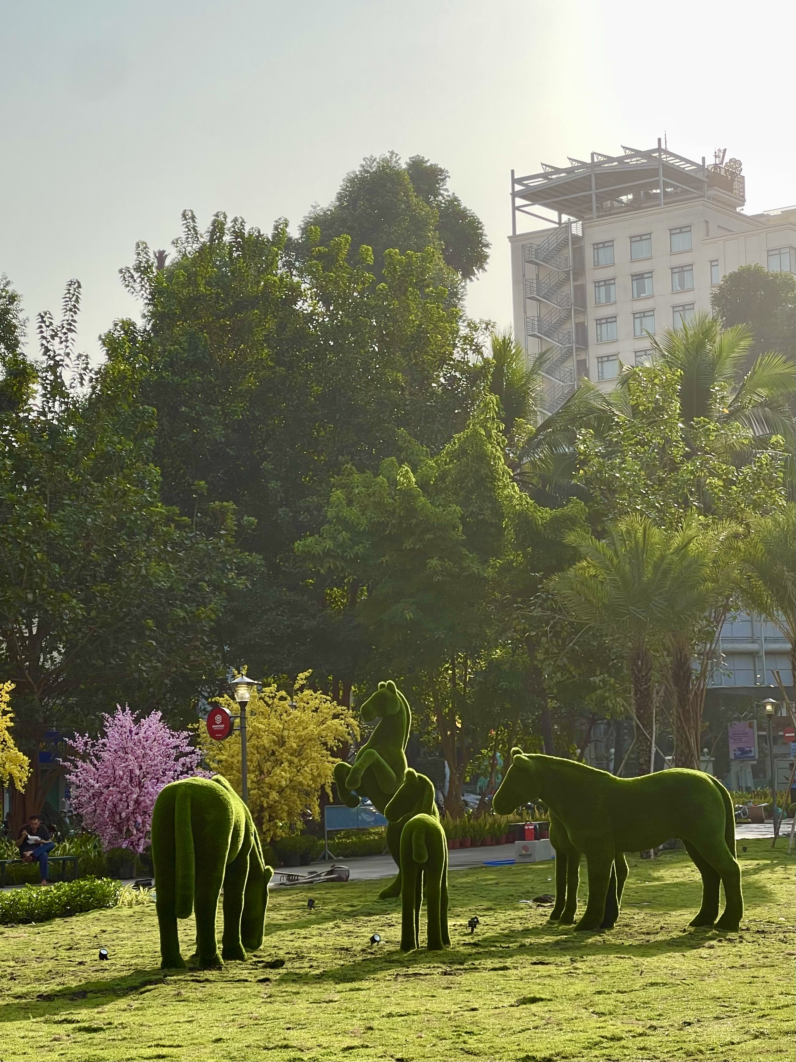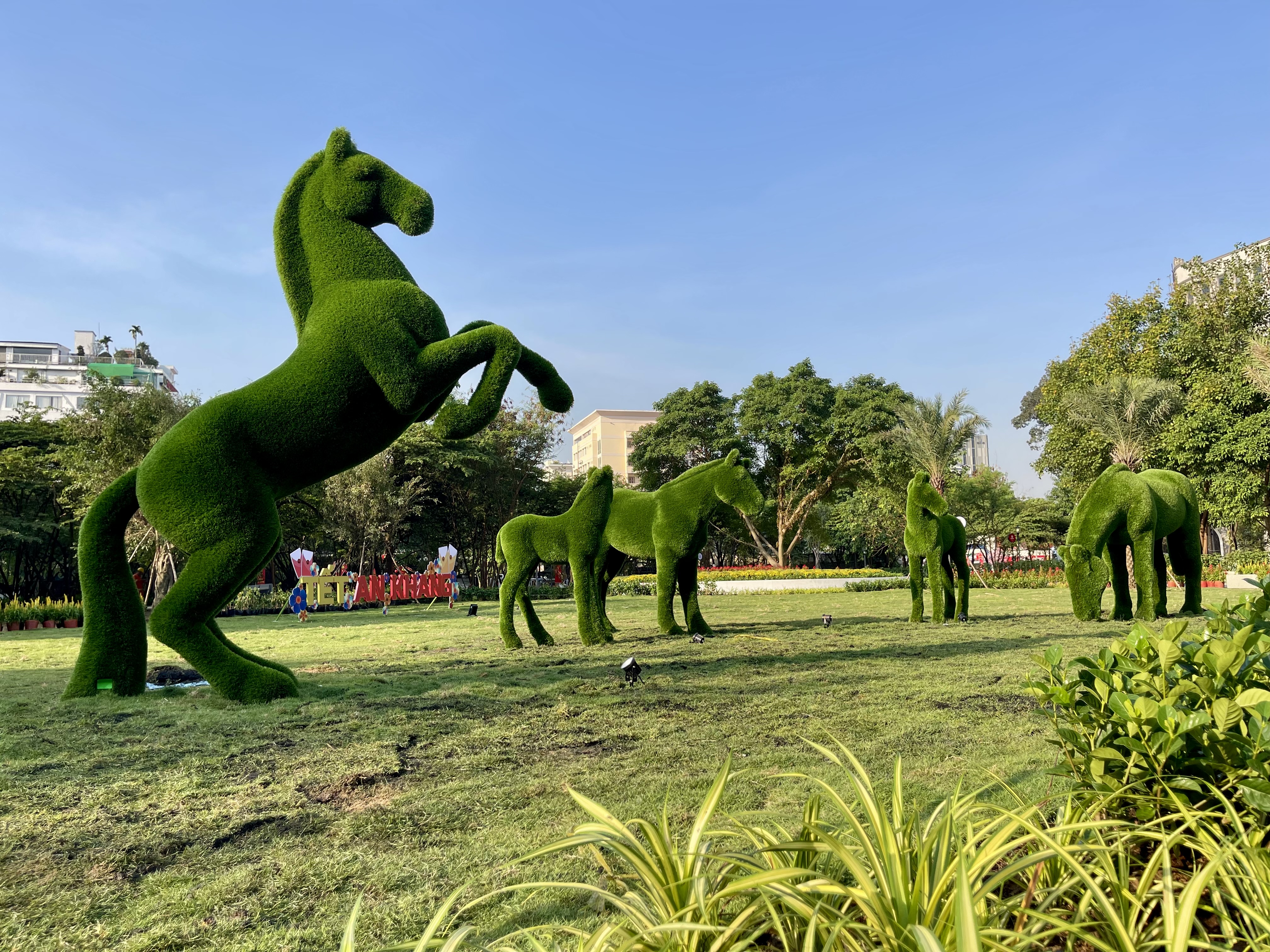 Đặc biệt, mô hình gia đình ngựa bằng cỏ được tạo hình sinh động trên thảm cỏ trung tâm trở thành điểm nhấn, mang không khí xuân tươi mới.