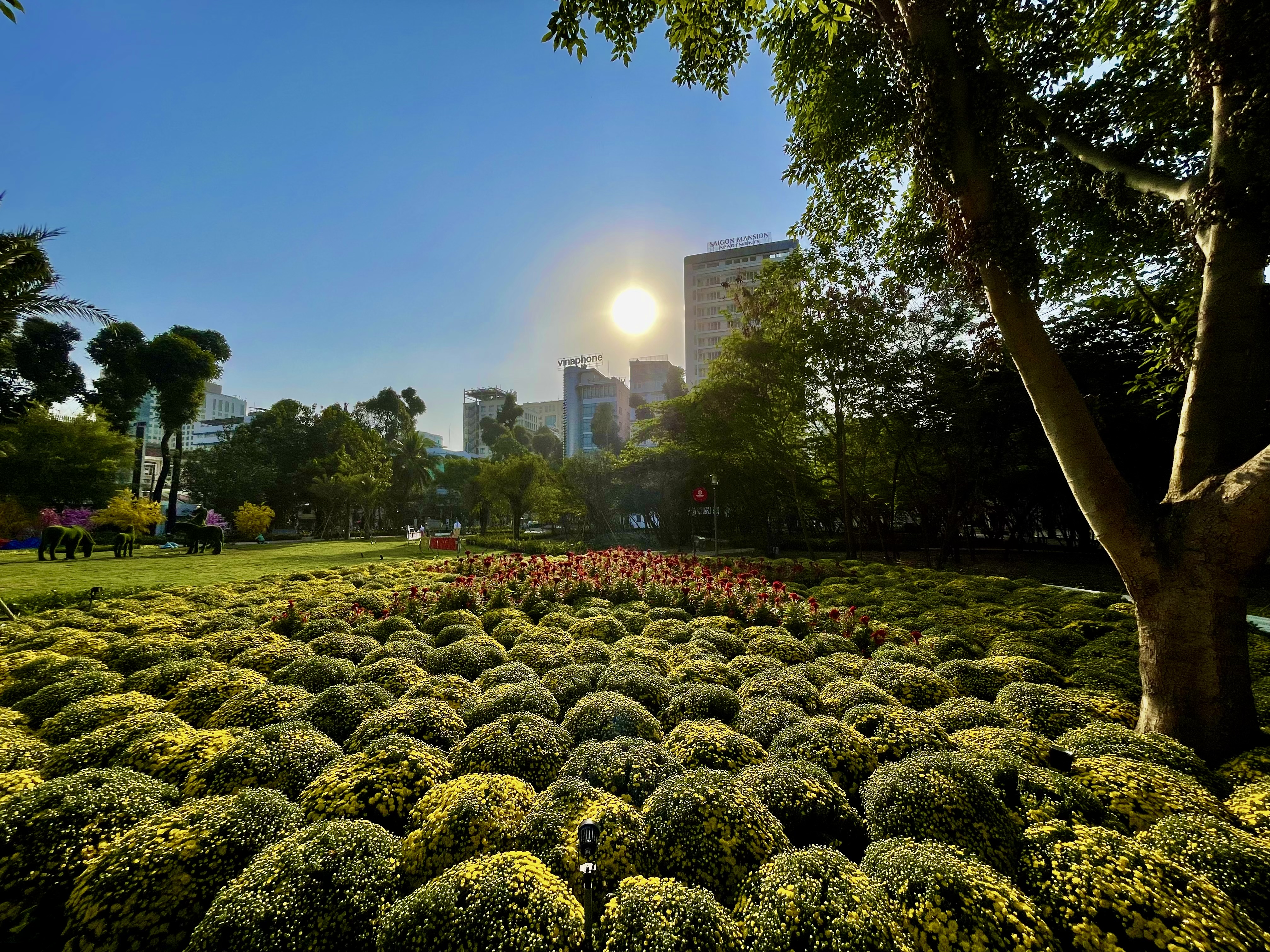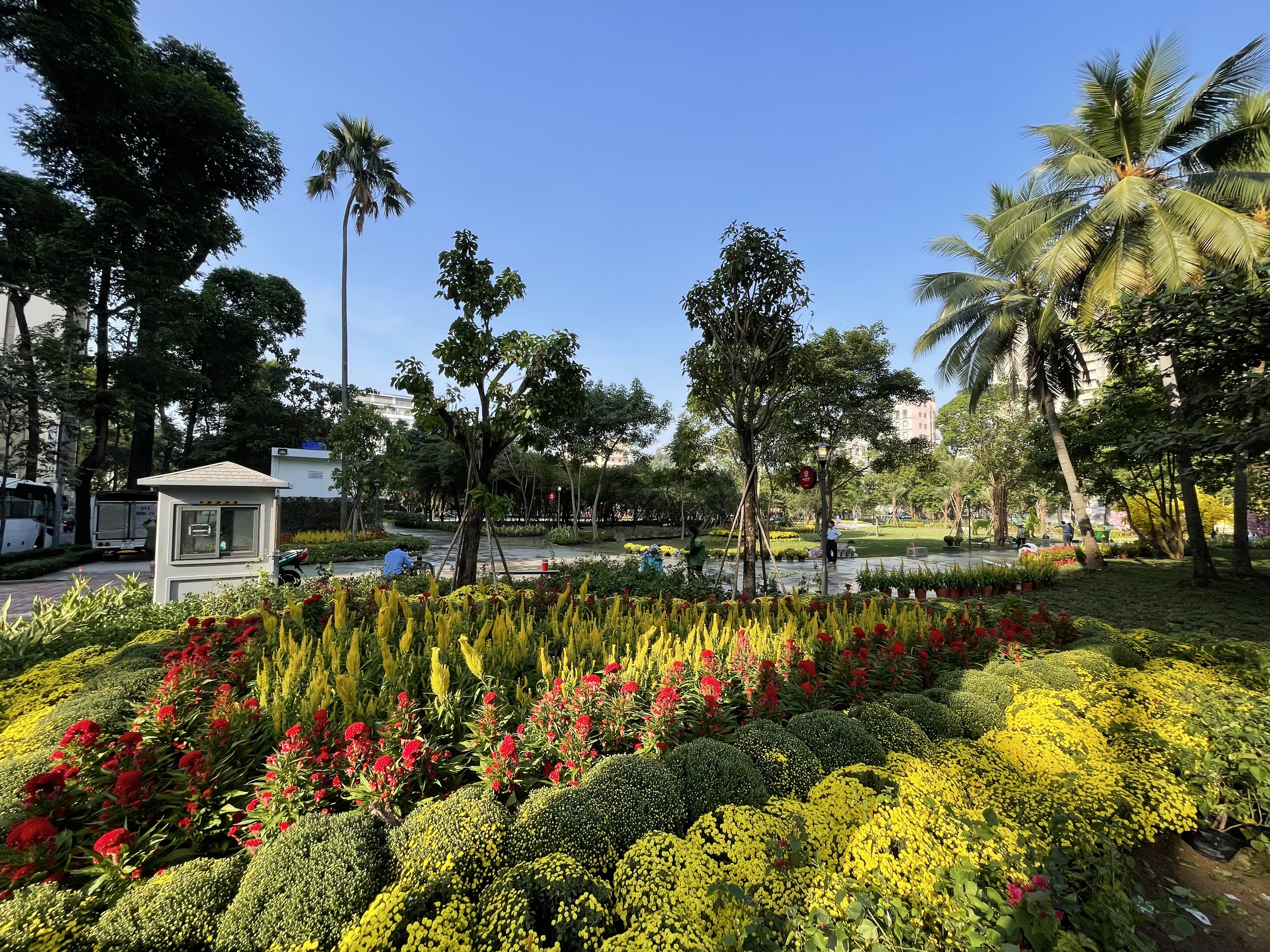 Ghi nhận tại hiện trường, khuôn viên công viên được phủ xanh với nhiều thảm cỏ, cây xanh bóng mát và hàng loạt bồn hoa được bố trí hài hòa, tạo nên không gian sinh động giữa trung tâm đô thị.