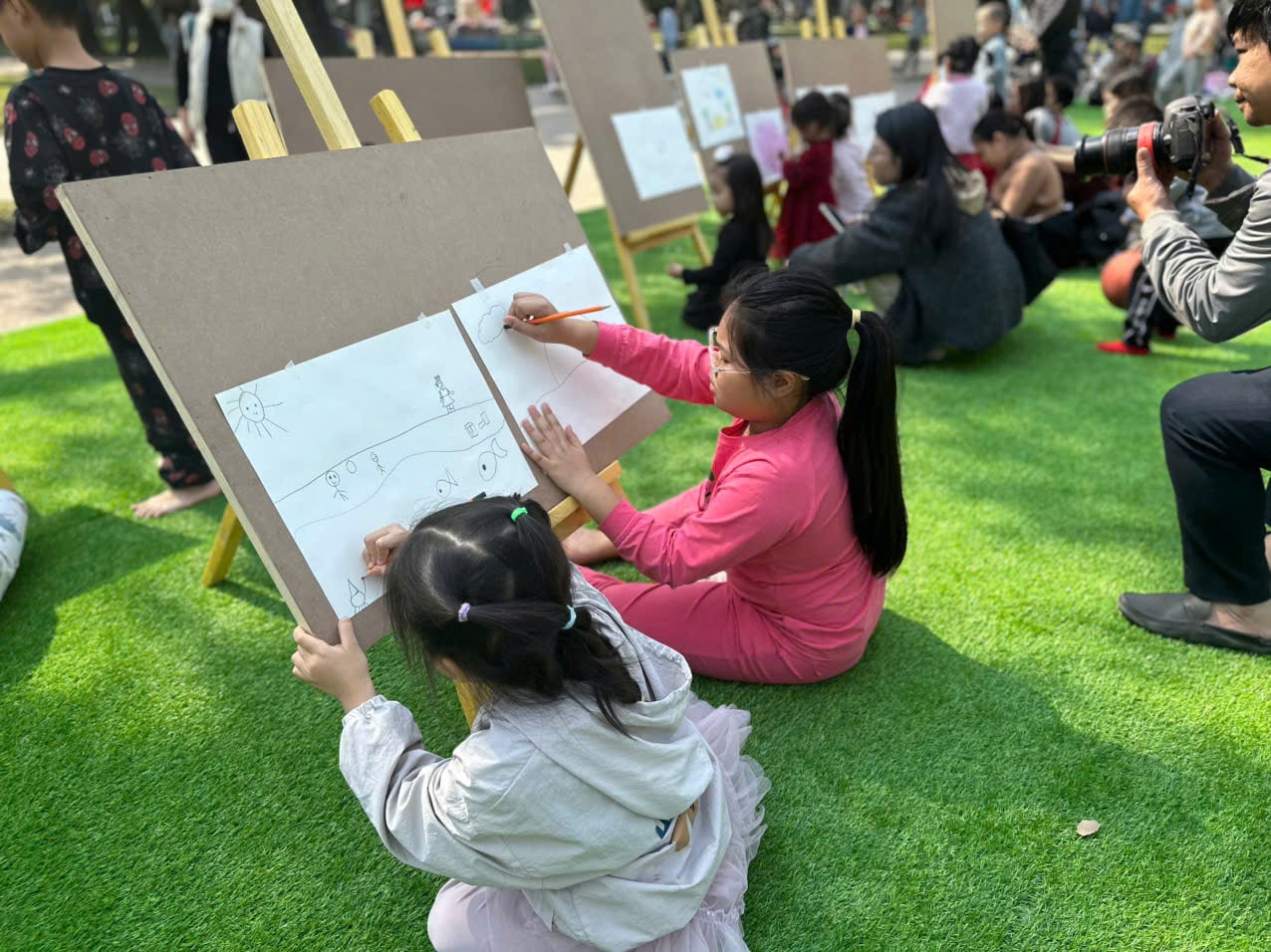 Nhiều em nhỏ rất thích thú khi tham gia vẽ tranh tại công viên. Ảnh: Hoàng Lân