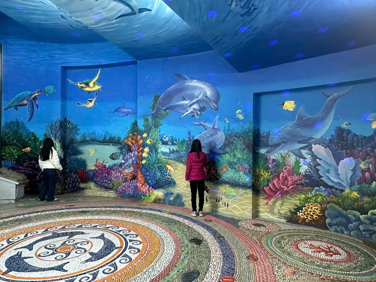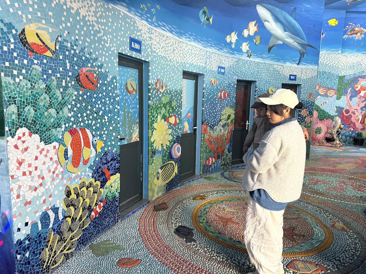 Nhà Gương được trang trí như một bức tranh nghệ thuật với những mảng tường gốm nghệ thuật với chủ đề về đại dương. Ảnh: Hoàng Lân.
