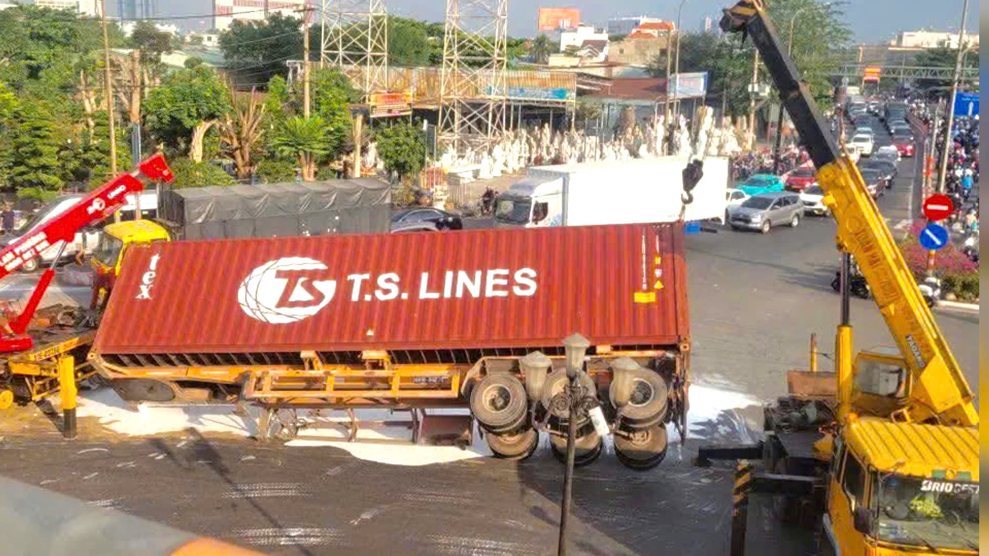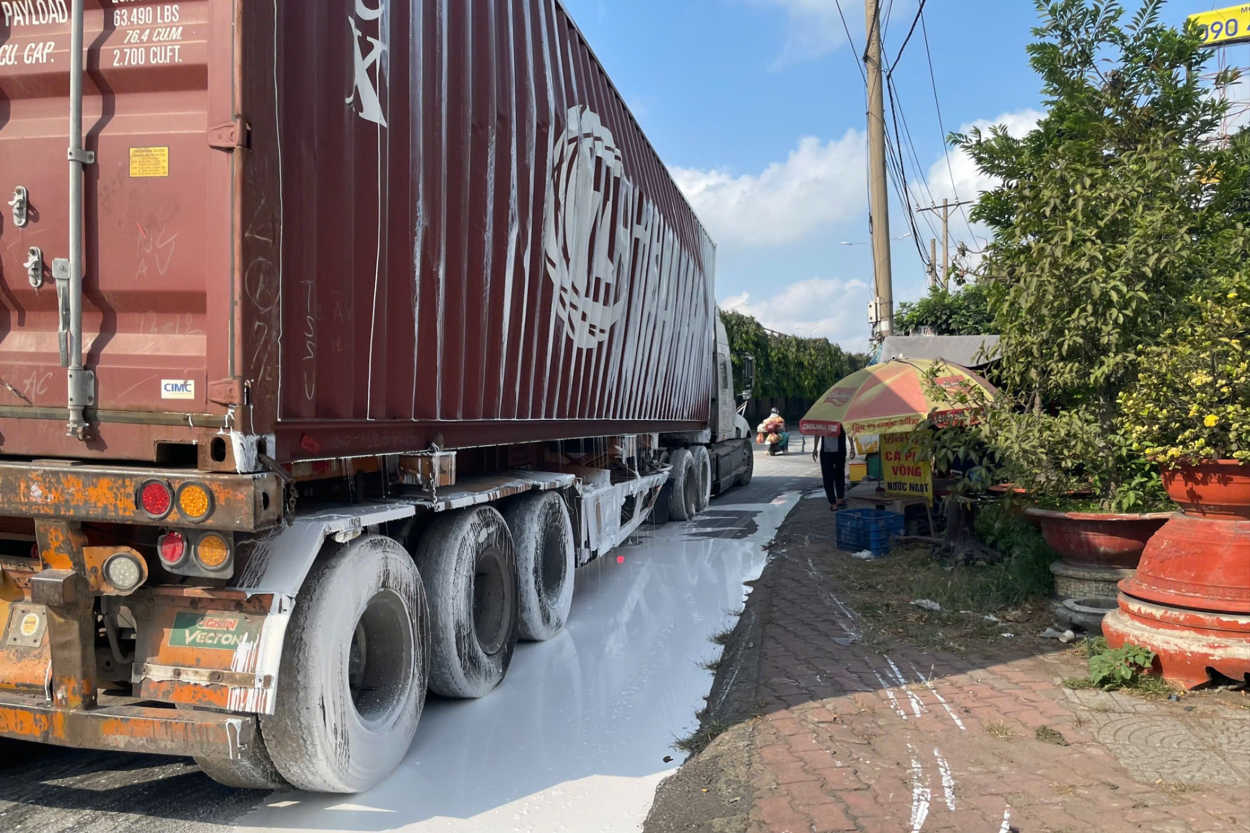 Xe container lật nhào, lượng sơn lớn đổ tràn ra đường. Ảnh: XUÂN MINH