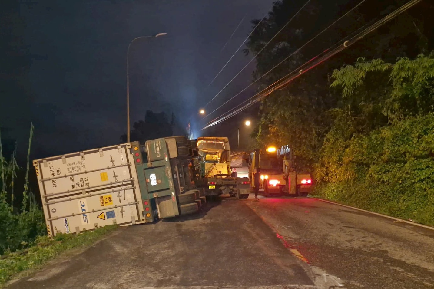 Tai nạn khiến thùng container lật nghiêng xuống đường