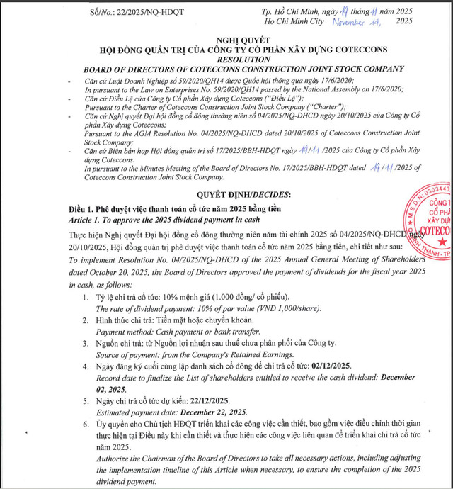 Theo thông tin được công bố, Coteccons cho biết ngày 2/12 tơíđây sẽ chốt danh sách cổ đông để trả cổ tức tiền mặt năm 2025. Tỷ lệ chi trả là10%, tức mỗi cổ phiếu nhận 1.000 đồng. Ngày chi trả dự kiến là 22/12/2025.