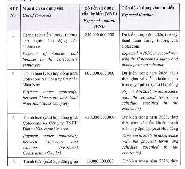 Thời gian phân phối dự kiến tối thiểu 20 ngày, tối đa 90 ngày theo quy định của pháp luật (chưa tính trường hợp gia hạn thời gian phân phối theo quy định, nếu cần). Về phương án sử dụng vốn, toàn bộ số tiền 1.400 tỷ đồng thu được từ đợt chào bán trái phiếu nêu trên sẽ được Coteccons dùng để thanh toán tiền lương, thưởng cho người lao động (250 tỷ), thanh toán hợp đồng giữa Coteccons và Công ty Nhật Nam 600 tỷ, thanh toán hợp đồng giữa Coteccons và Coong ty TNHH Đầu tư Xây dựng Unicons 430 tỷ.