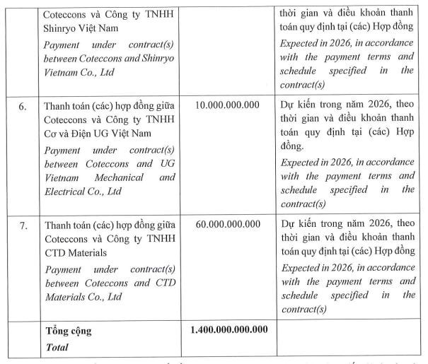 Ngoài ra, công ty cũng dành 50 tỷ để thanh toán hợp đồng giữa Coteccons với Công ty TNHH Shinryo Việt Nam, 60 tỷ đồng để thanh toán hợp đồng với Công ty TNHH CTD Materials...