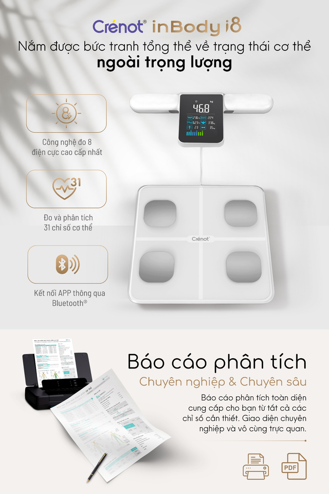 Đây là dòng cân cao cấp nhất của cả Crenot và thị trường cân điện tử sức khỏe, được ví như "trợ lý sức khỏe tại nhà" nhờ khả năng đo toàn bộ cơ thể với 8 điểm chạm, thay vì chỉ đo nửa thân dưới như các dòng cân 4 điểm chạm thông thường. Crenot inBody i8 phân tích chi tiết tới 31 chỉ số, bao gồm các thành phần cơ thể từng vùng (tay, chân, bụng), cung cấp báo cáo phân tích chuẩn phòng gym, giúp người dùng có cái nhìn toàn diện nhất về sức khỏe của mình.
