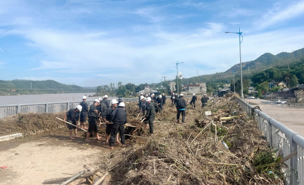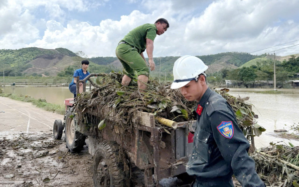 CSCĐ Công an tỉnh Đắk Lắk thu dọn cây cối, rác thải do lũ cuốn tồn đọng tràn ngập trên cầu đường bộ La Hai ở xã Đồng Xuân.