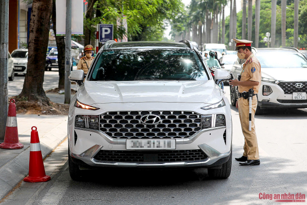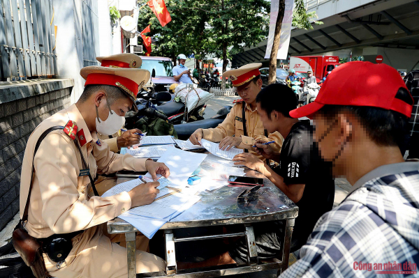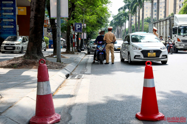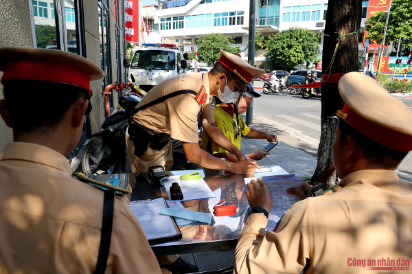 Ghi nhận của PV Báo CAND tại khu vực ngã tư Thanh Nhàn - Bạch Mai (Phường Thanh Nhàn, Hà Nội), tổ công tác của Đội CSGT số 4 (Phòng CSGT Công an TP Hà Nội) triển khai cắm chốt dừng kiểm tra đối với tất cả người điều khiển phương tiện xe máy, ô tô lưu thông trên đường.