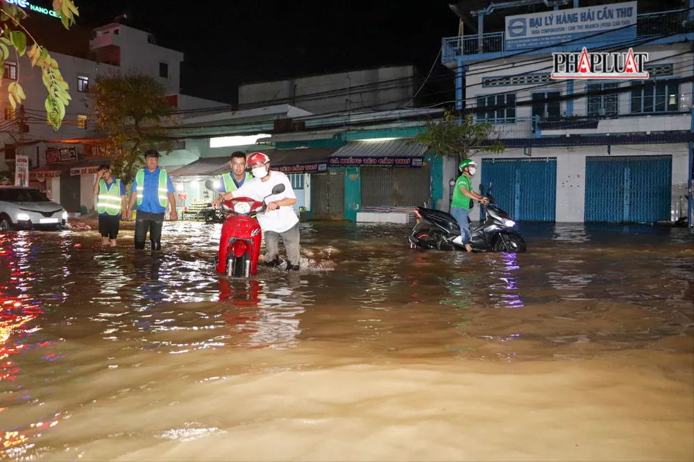 Trước tình hình nước ngập ảnh hưởng lưu thông và tiềm ẩn nguy cơ tai nạn, Đội CSGT số 1 thuộc phòng CSGT Công an TP Cần Thơ đã cử cán bộ ứng trực tại đoạn ngập sâu để điều tiết giao thông.