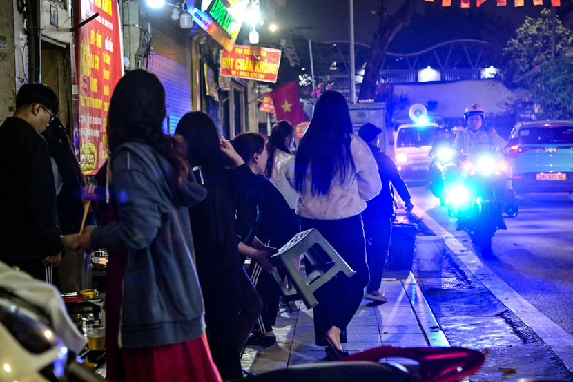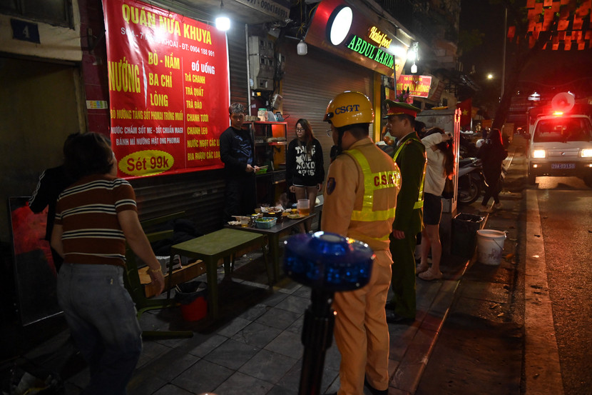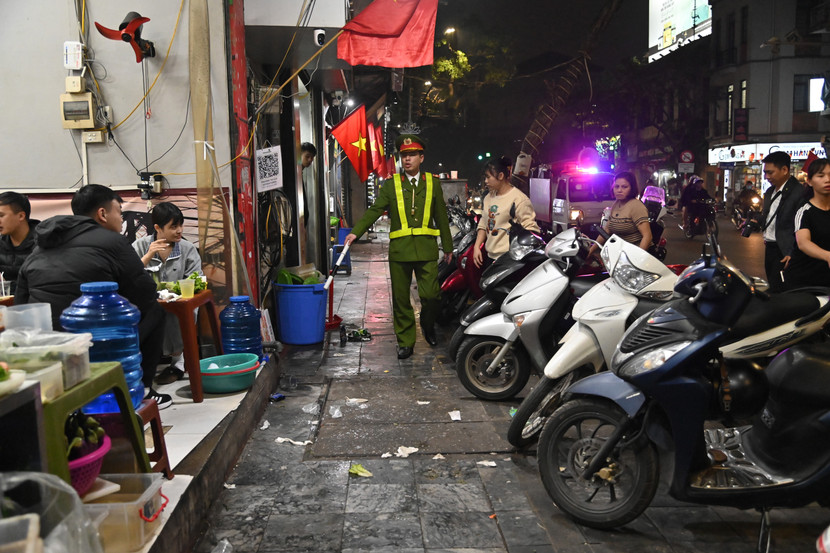 Một hàng ăn đêm đang chiếm dụng vỉa hè, cầm ghế chạy, khi thấy "tổ công tác" mới của lực lượng Công an tuần tra đảm bảo trật tự đô thị.