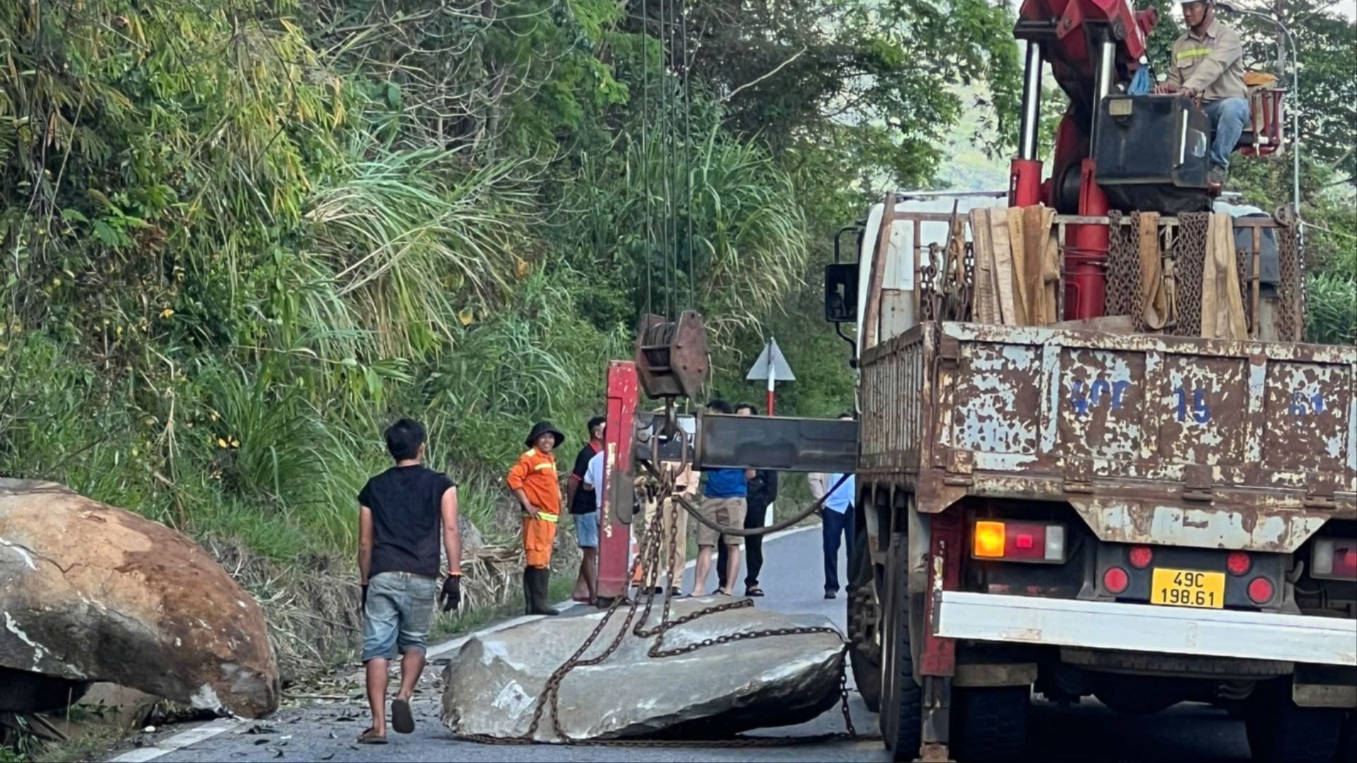 Nhằm phòng ngừa rủi ro, lực lượng CSGT đã phối hợp triển khai phương tiện, dùng xe cẩu đưa các tảng đá nguy hiểm xuống mặt đường để kiểm soát và dọn dẹp. Trong quá trình xử lý, CSGT tiến hành phân luồng, điều tiết để các phương tiện lưu thông an toàn.