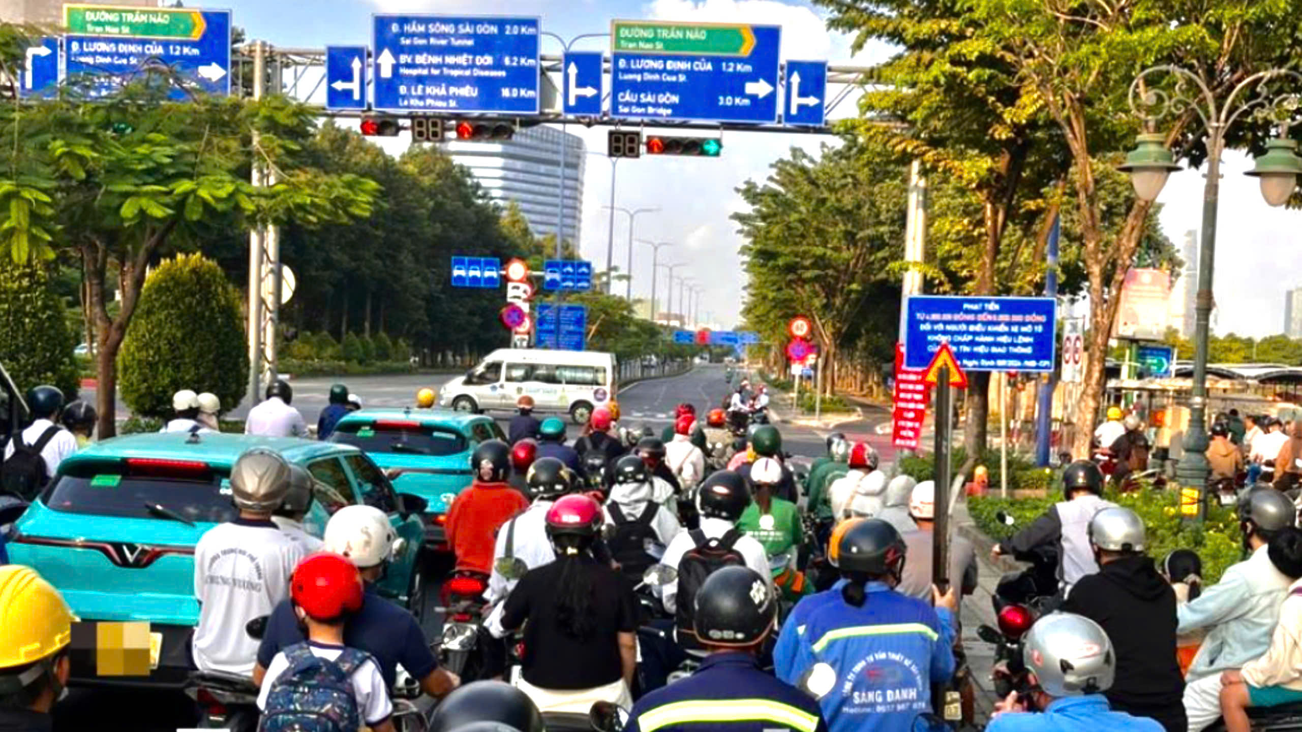 Giờ tan tầm, lượng phương tiện đổ dồn về nút giao Mai Chí Thọ – Trần Não tăng cao. Ảnh: PC08