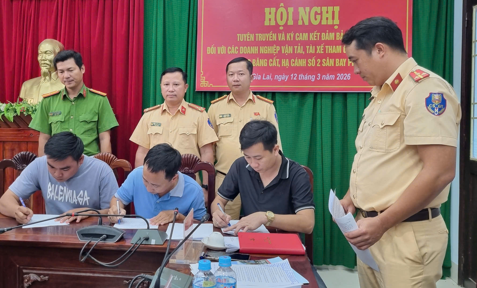 Chiều 12/3, Đội CSGT đường bộ số 4 (Phòng CSGT Công an tỉnh Gia Lai) tổ chức hội nghị tuyên truyền và ký cam kết đảm bảo trật tự an toàn giao thông (ATGT) đối với các doanh nghiệp vận tải, tài xế tham gia thi công dự án đường cất hạ cánh số 2 và các công trình đồng bộ Cảng hàng không Phù Cát (mở rộng sân bay Phù Cát).