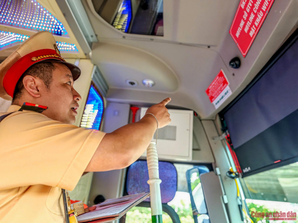 Cán bộ CSGT kiểm tra hệ thống camera giám sát hành trình trên xe khách. Thông qua thiết bị giám sát hành trình, CSGT sẽ nắm được thời gian xuất phát, tuyến đường di chuyển và thời gian lái xe liên tục của tài xế; còn camera thu thập hình ảnh người lái thì để kiểm tra xem tài xế có sử dụng điện thoại khi lái xe hay không và dừng, đỗ đón trả khách thế nào.