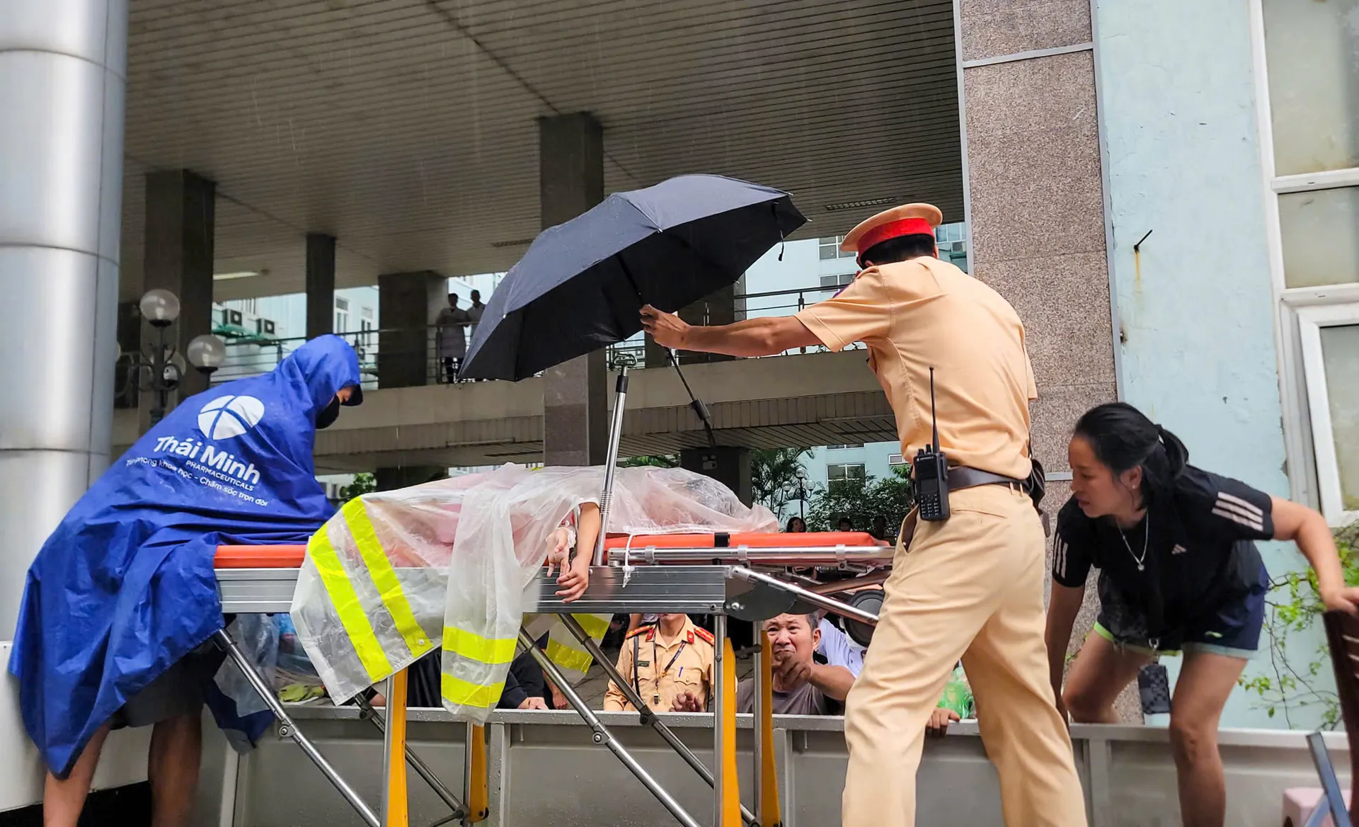 Lúc này, Tổ công tác của Đội CSGT đường bộ số 7 (Phòng CSGT Công an Hà Nội) đang ứng trực tại hiện trường đã nhanh chóng dùng ô tô đặc chủng để đưa các bệnh nhi đến bệnh viện. Do một bé 5 tuổi phải nằm trên cáng, các cán bộ, chiến sĩ CSGT đã hỗ trợ đưa lên thùng xe.